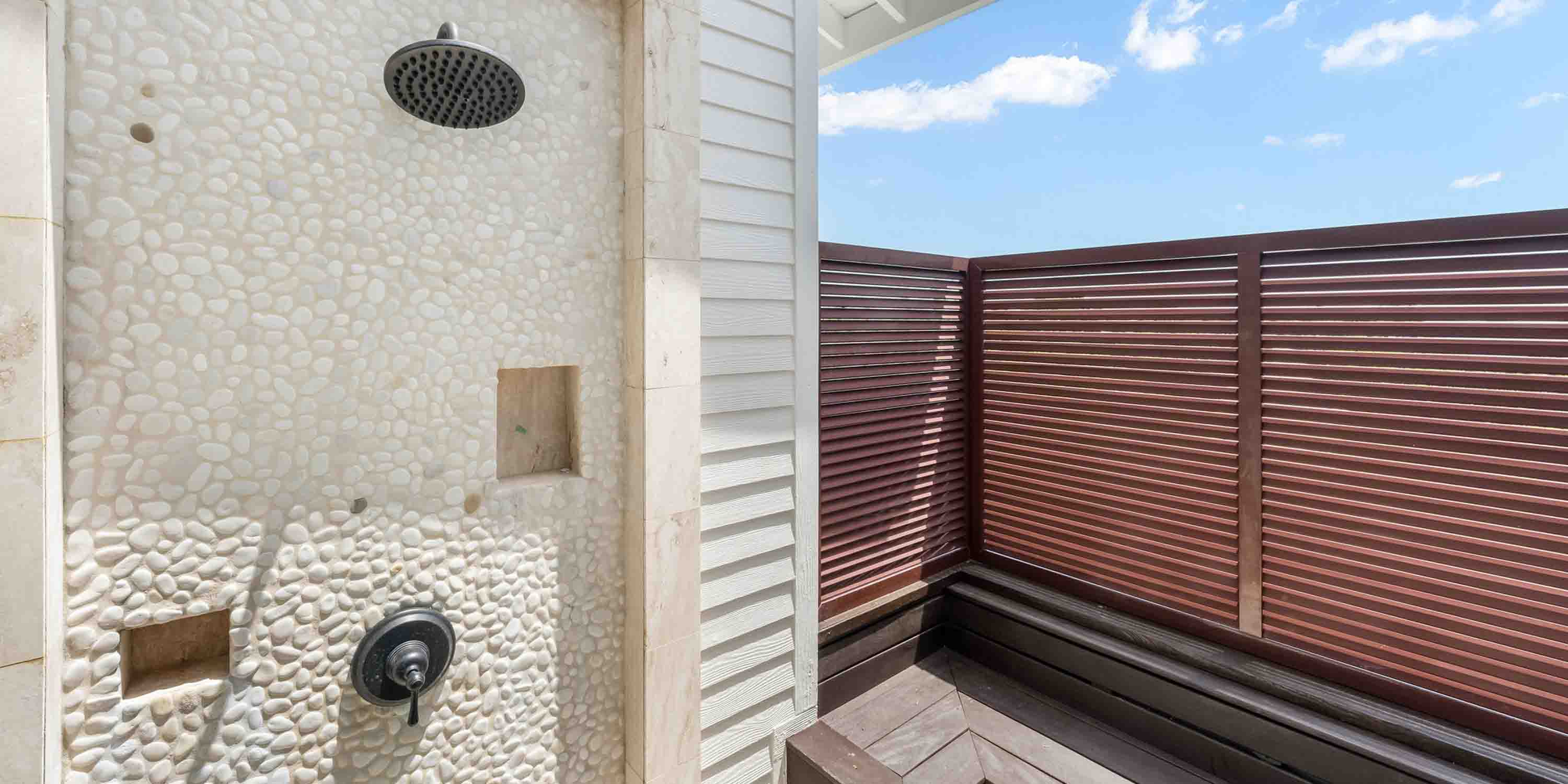 - Primary Suite: spans the entire upper level, king bed, walkout access to a private balcony, hidden console television, private study and home office, vaulted ceilings, ensuite with dual vanity, soaking bathtub, separate shower with rainfall element, plus an outdoor privacy shower.