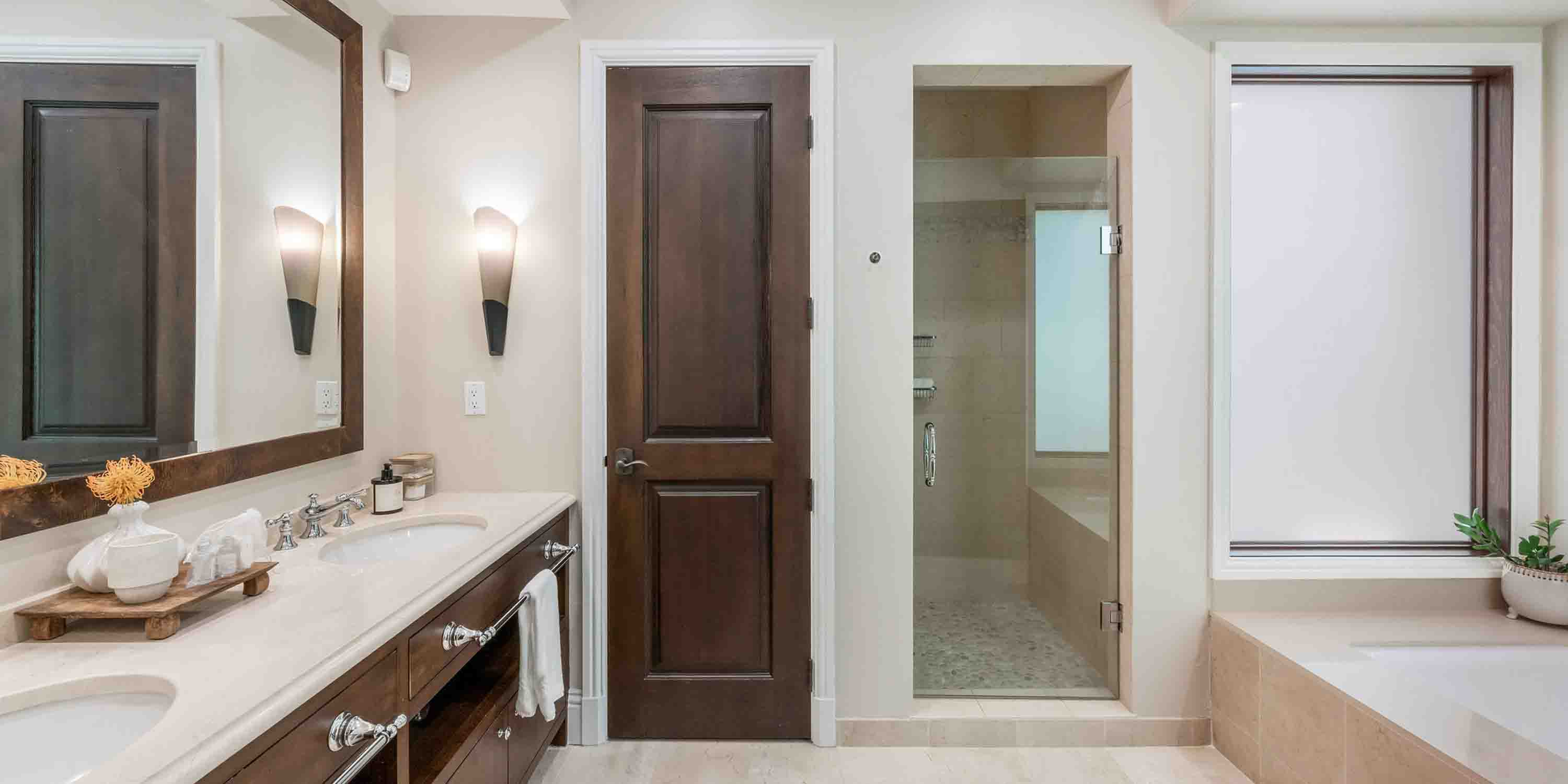 - Guest Suite: lower level, king bed, walk-out access to the pool deck, ensuite with dual vanity, separate shower, and soaking bathtub.