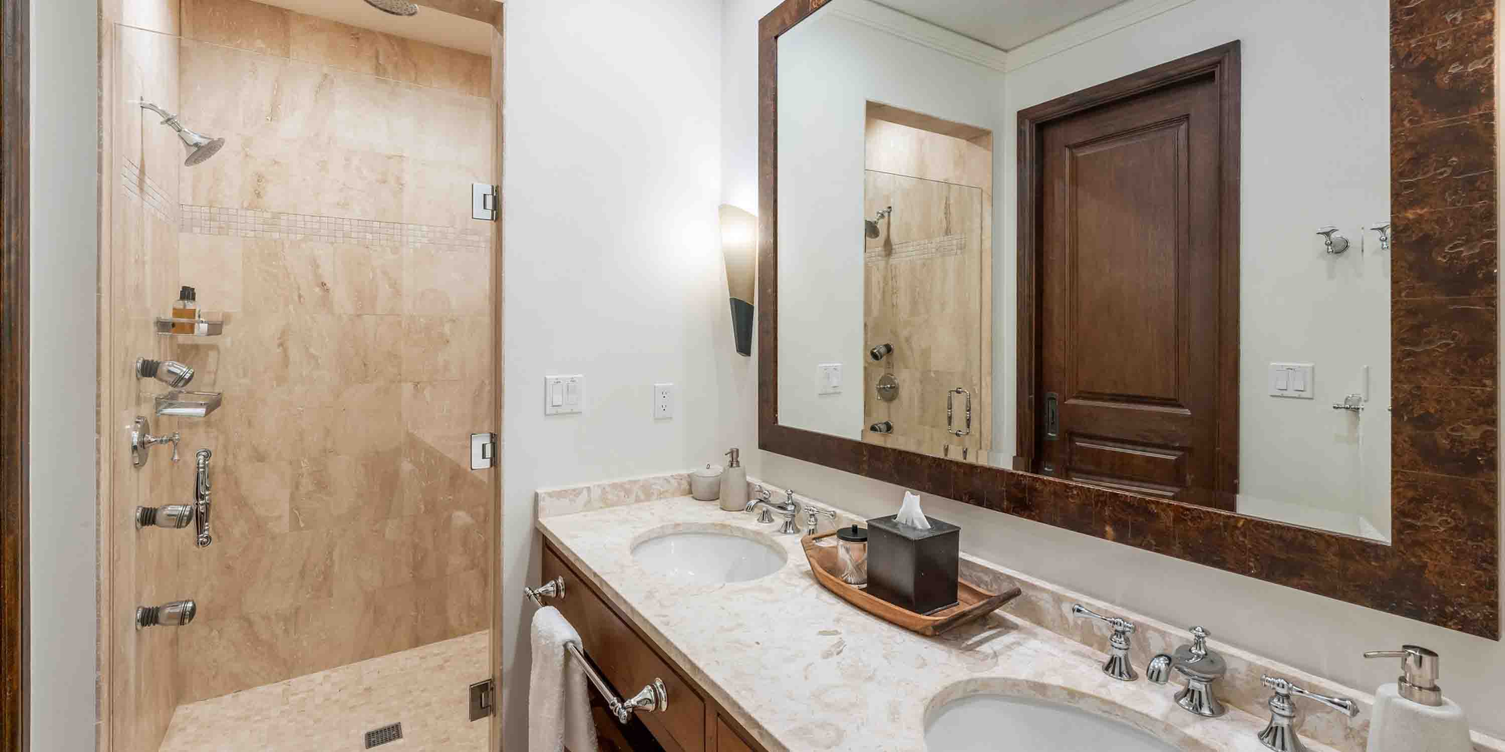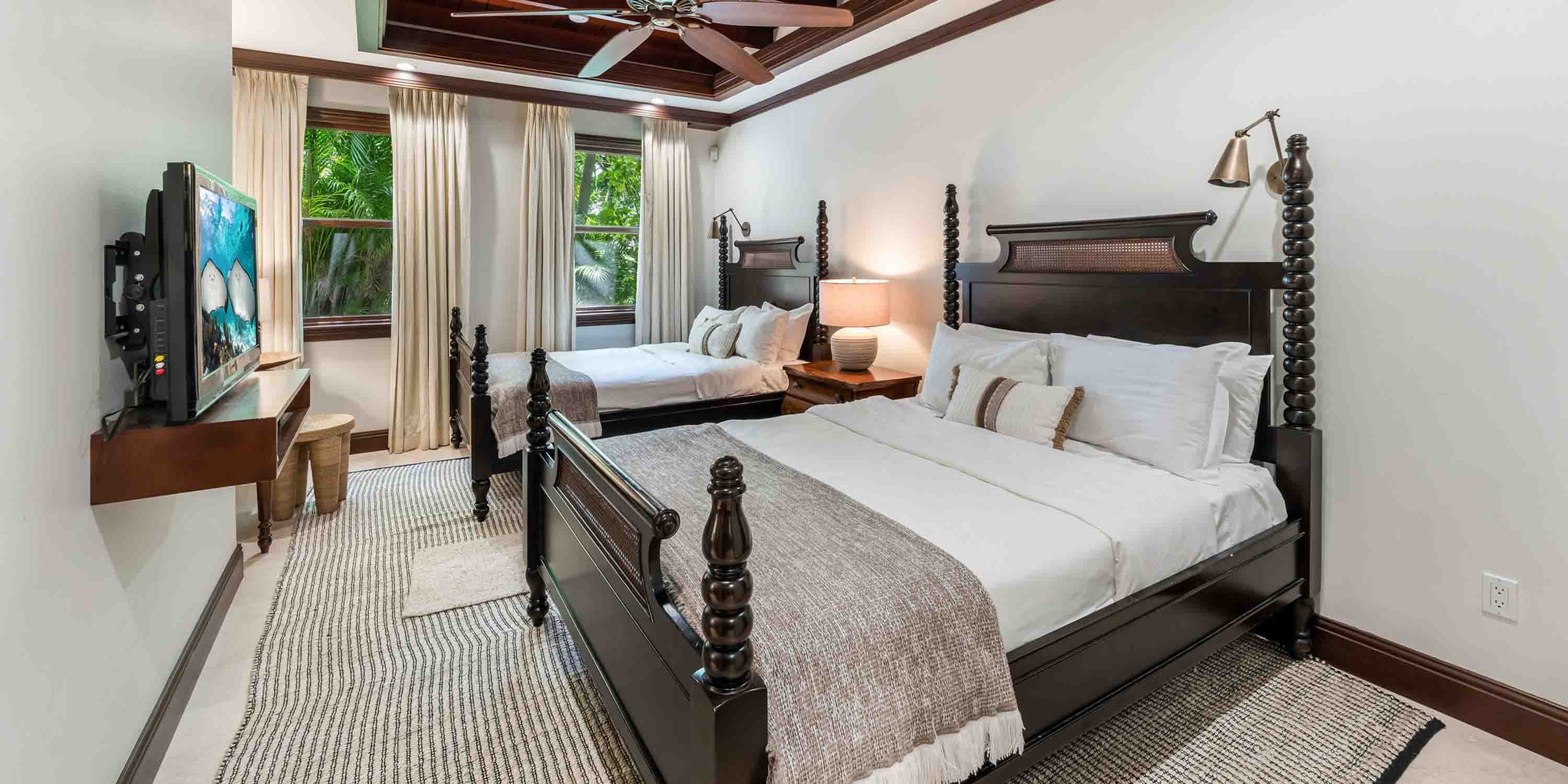- Guest Bedroom #2: lower level, two queen beds, television, shares a large bathroom equipped with dual vanities, soaking bathtub, separate shower, plus an outdoor shower.