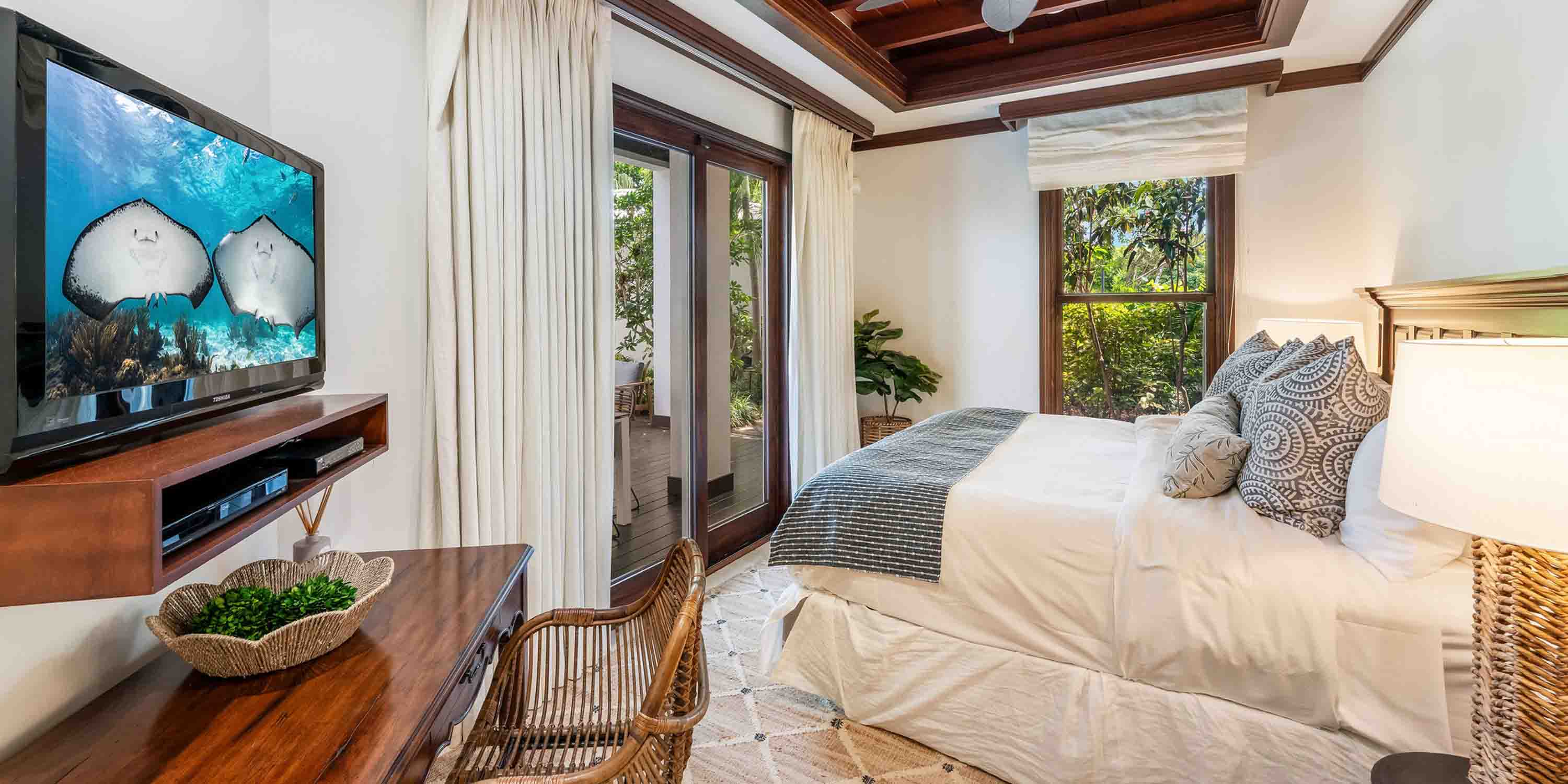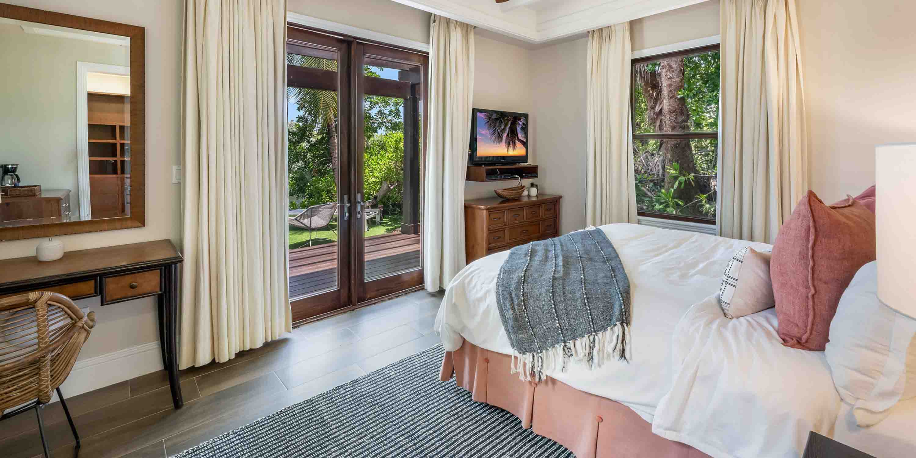 - Cottage Suite: detached from the main villa, private entry, king bed, television, ensuite with dual vanity, and shower with rainfall element.