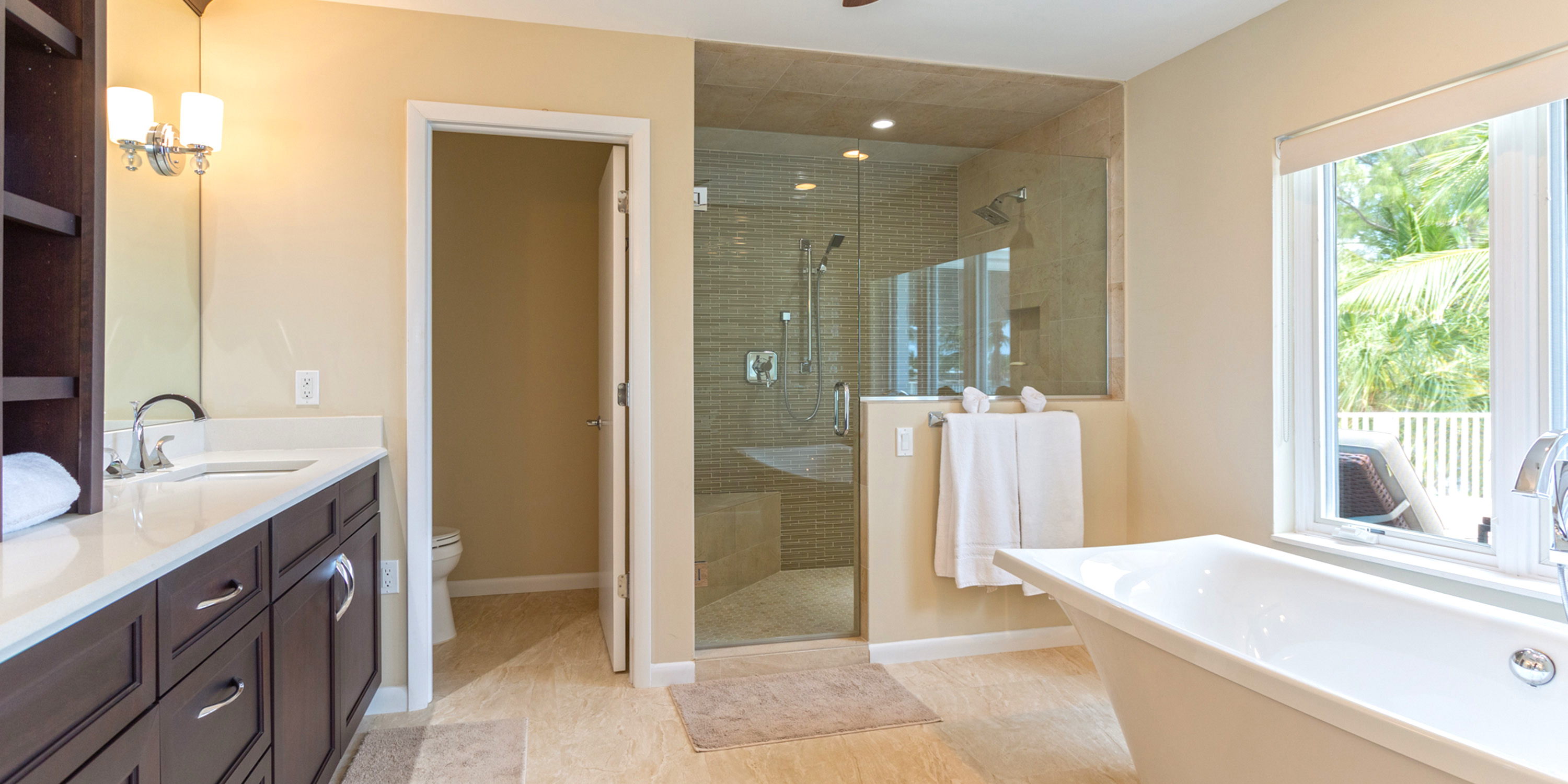 - Primary Suite: upper level, ocean views, king bed, SmartTV, walkout access to a furnished screened balcony and railed sundeck with loungers, ensuite with dual vanity, water closet, soaking tub, and separate shower.