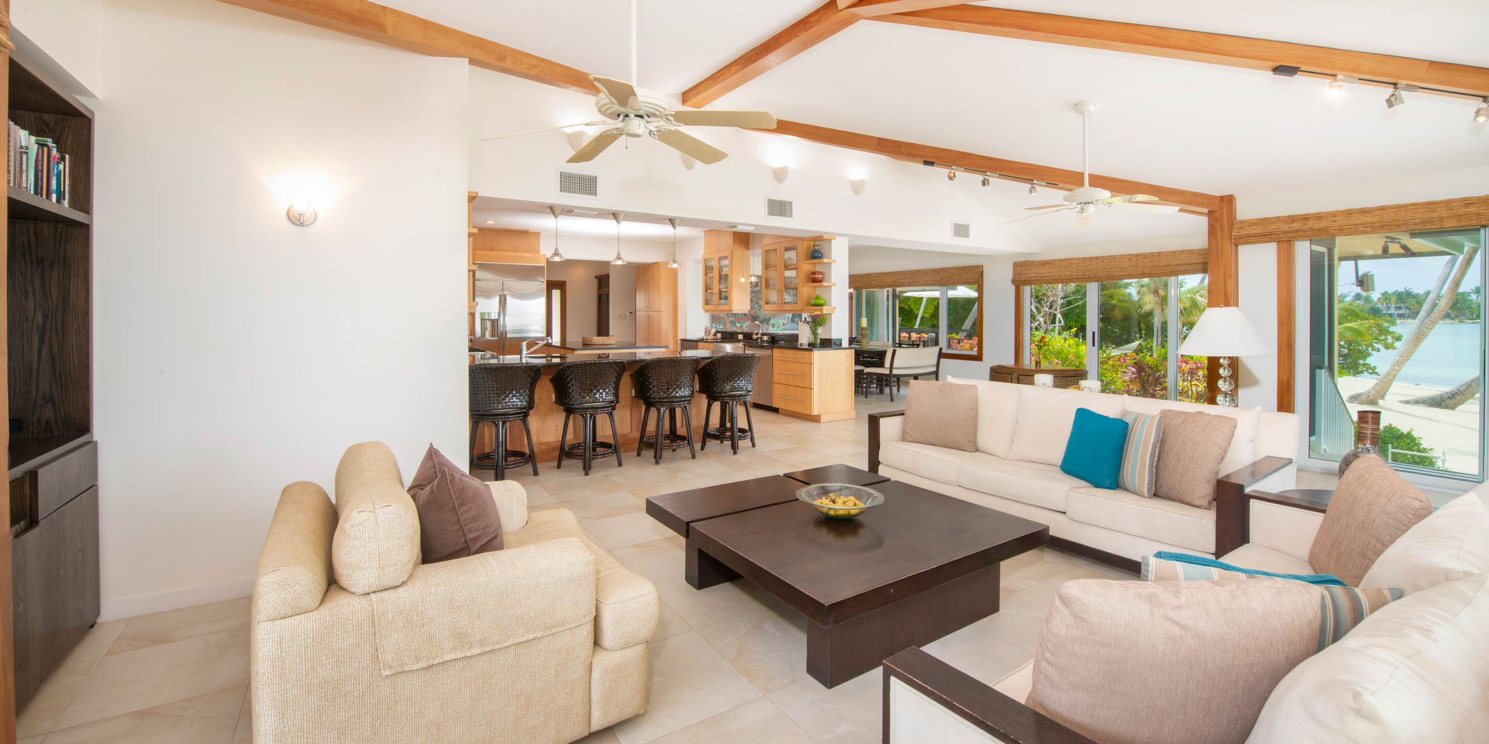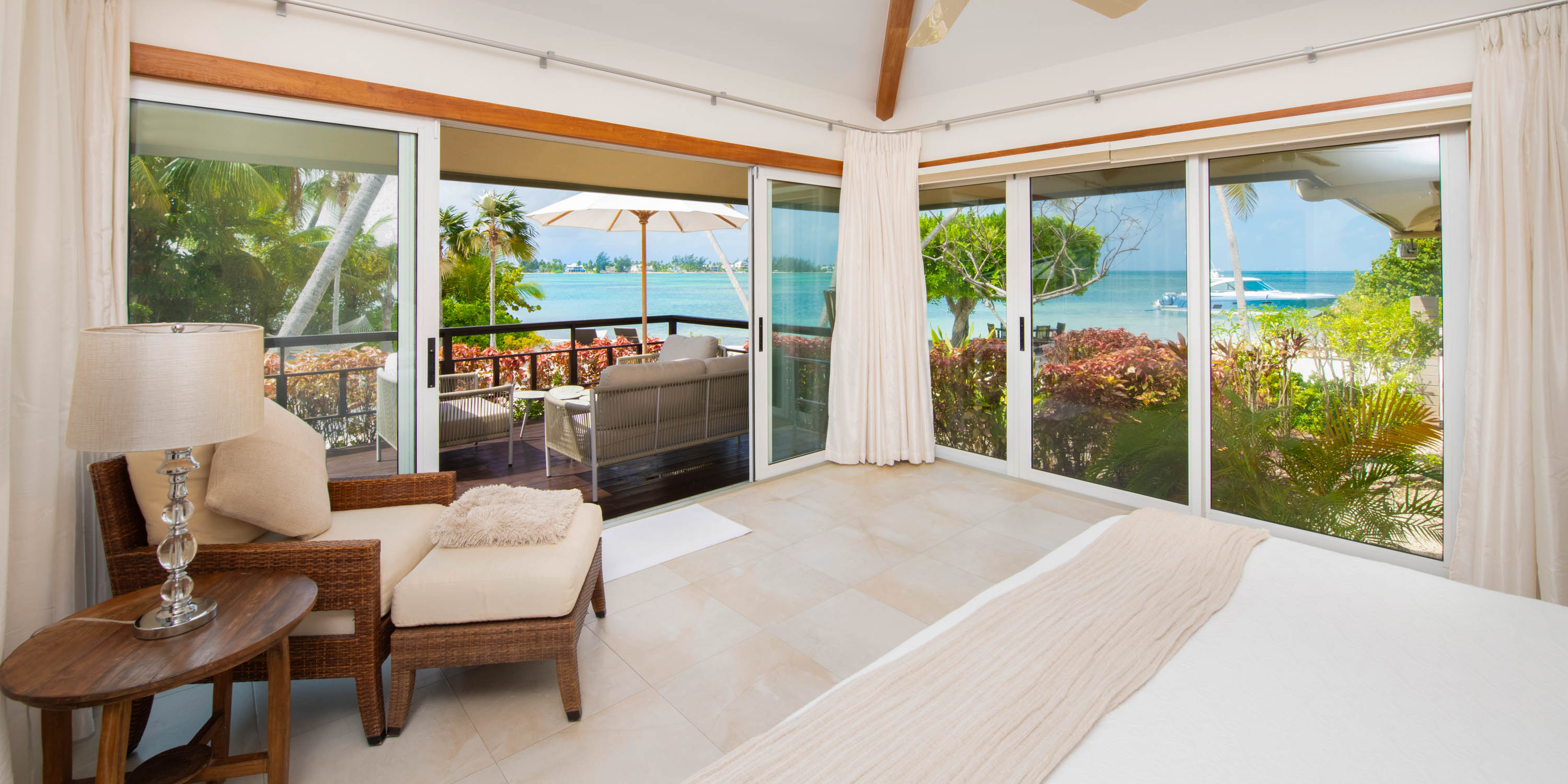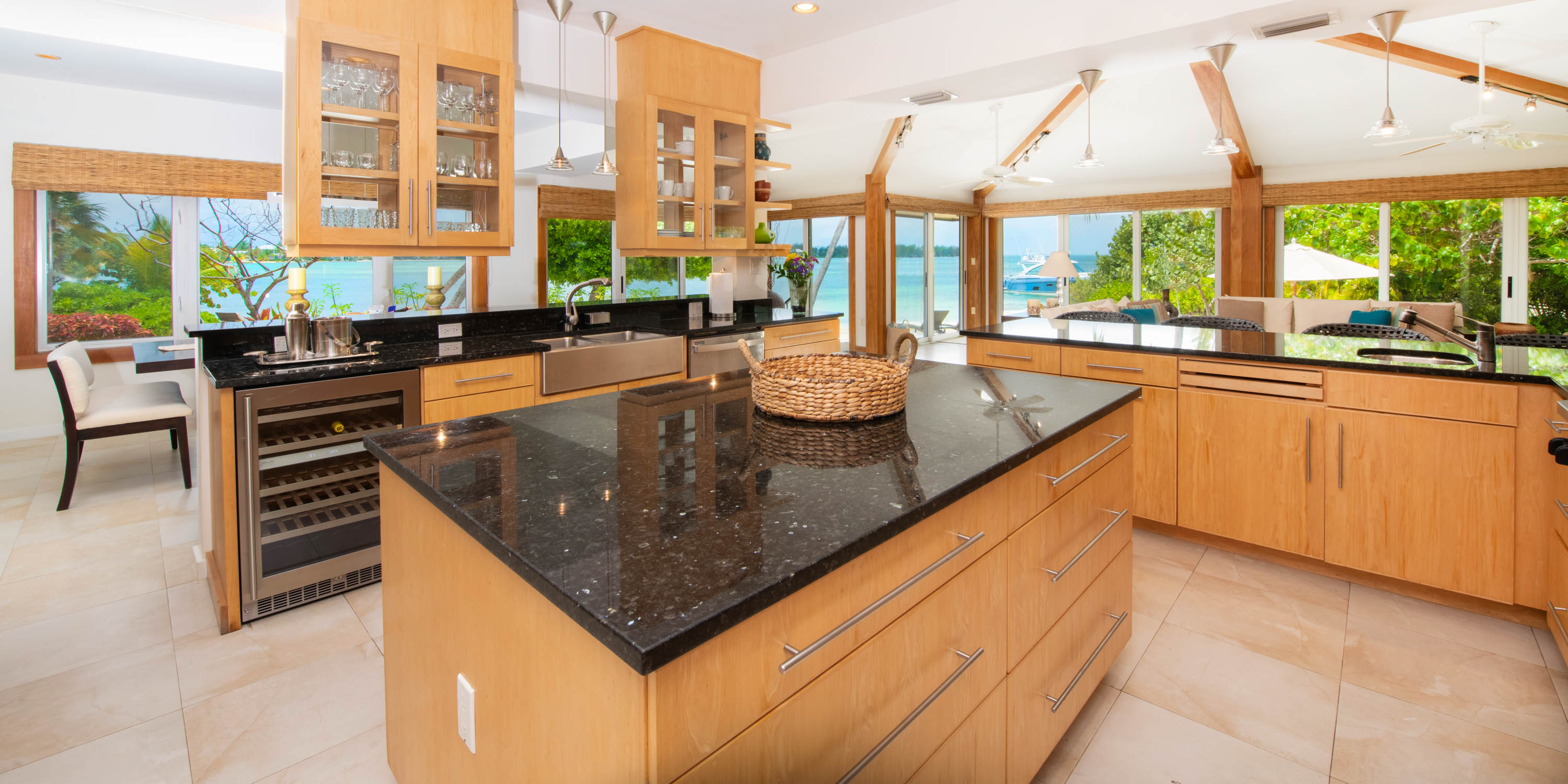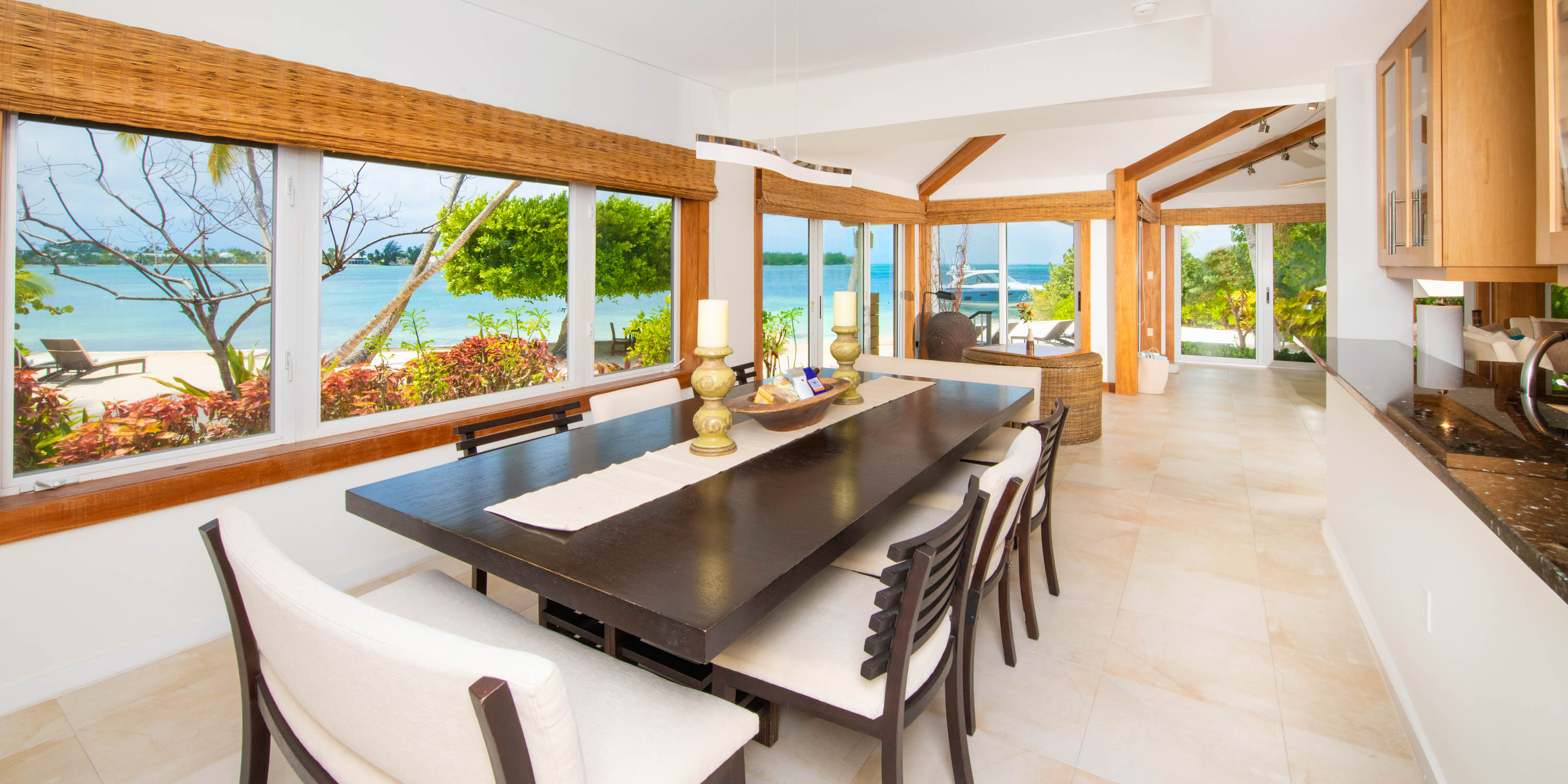 Plenty of oceanfront windows and sliding doors fill the living area, kitchen, and bar with sunlight and panoramic views of the azure waters off of Cayman Kai. The fully equipped, modern kitchen offers all the standard appliances, dishware, cookware, and cutlery.
