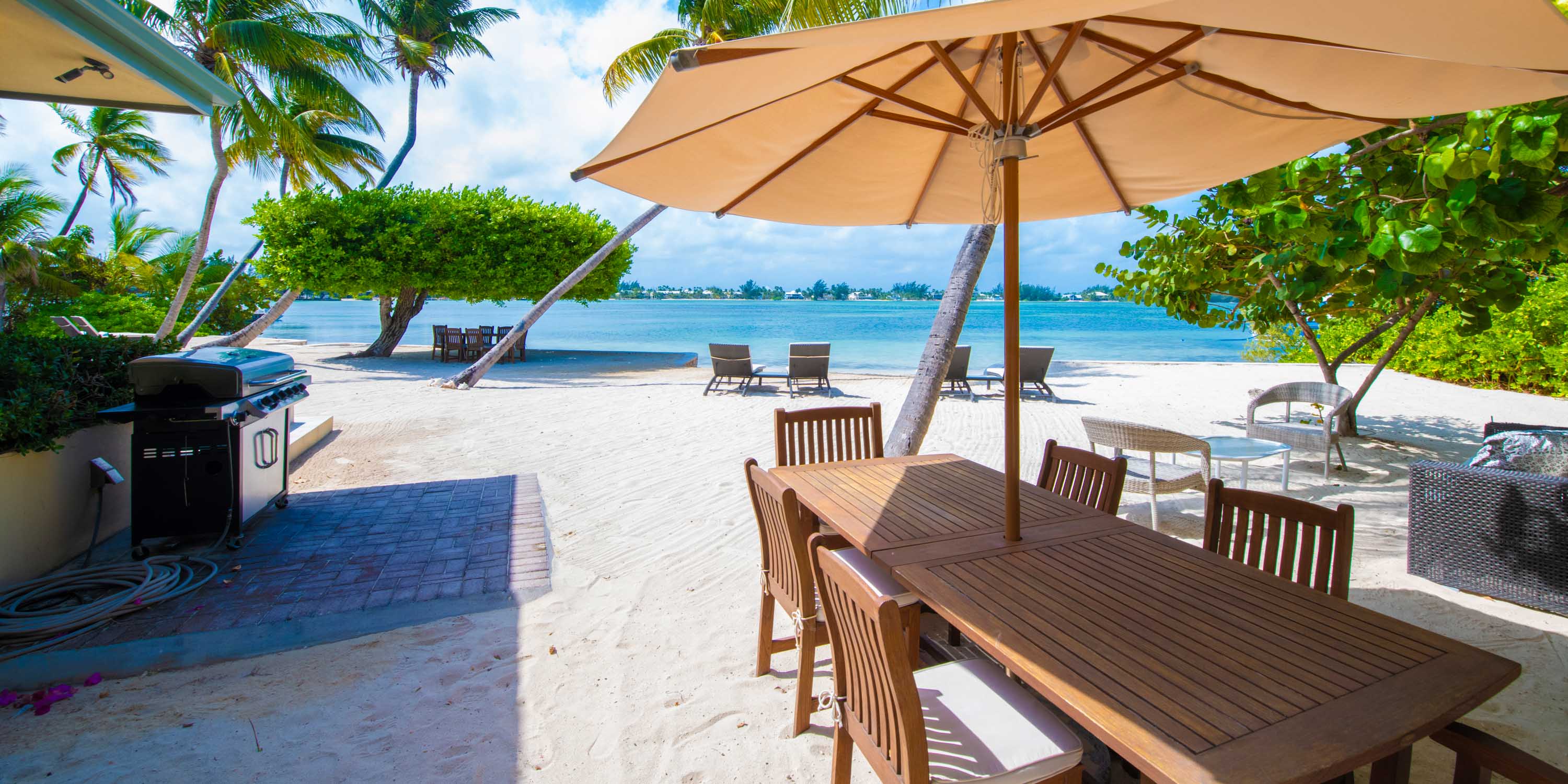 - Barefoot swimming beach just steps from the back door with lounge chairs, palm-shaded hammock, and propane grill