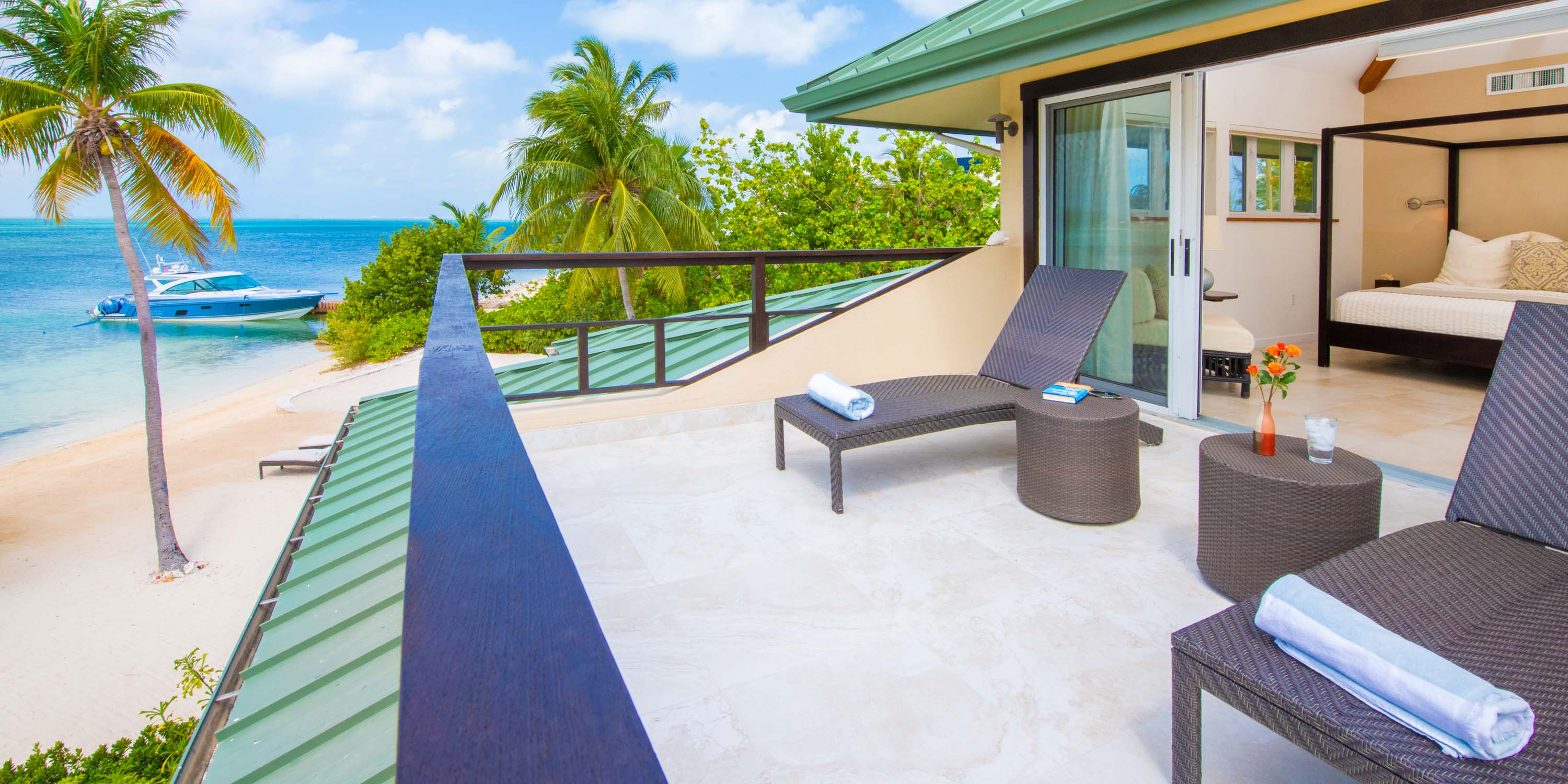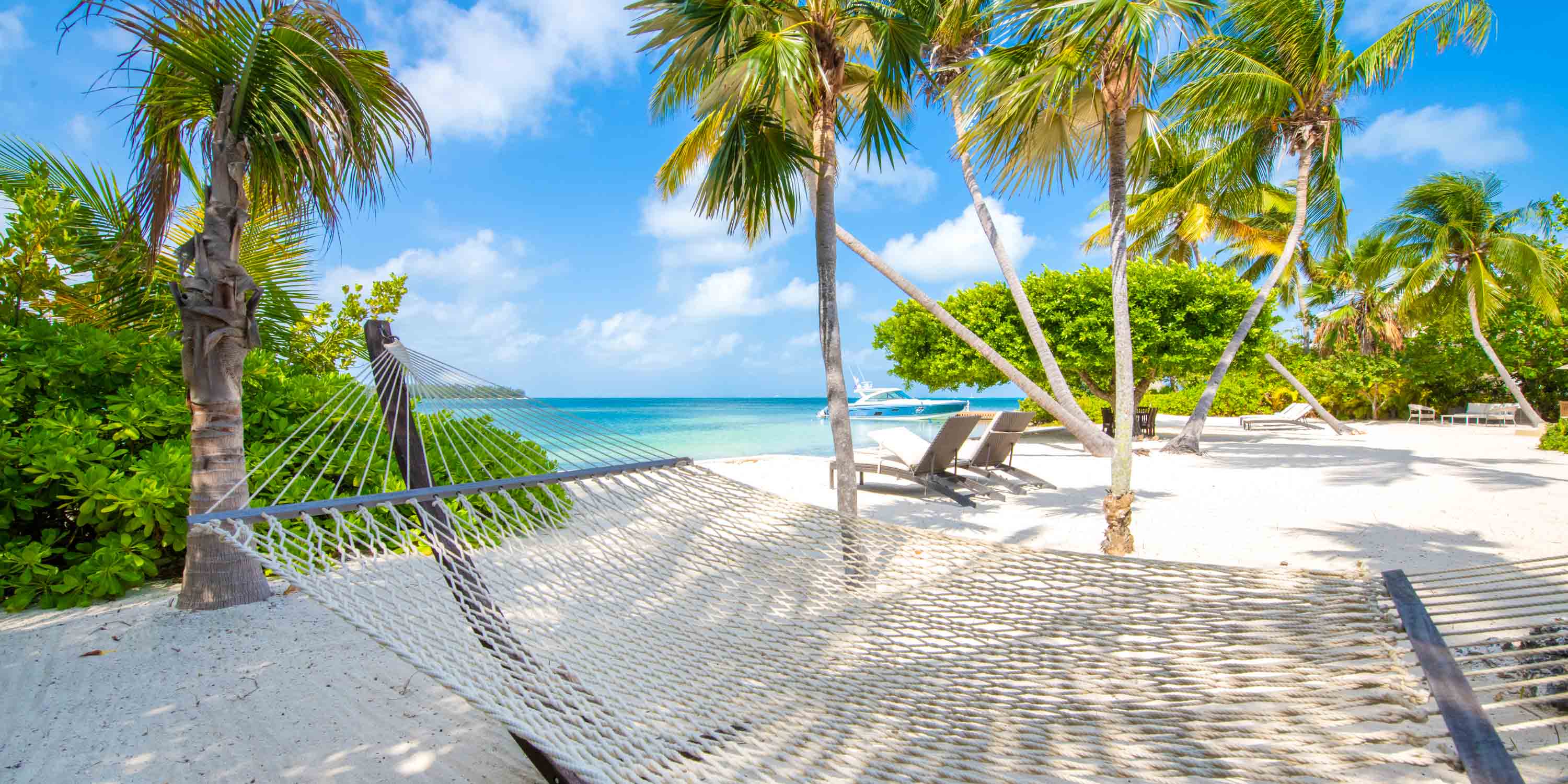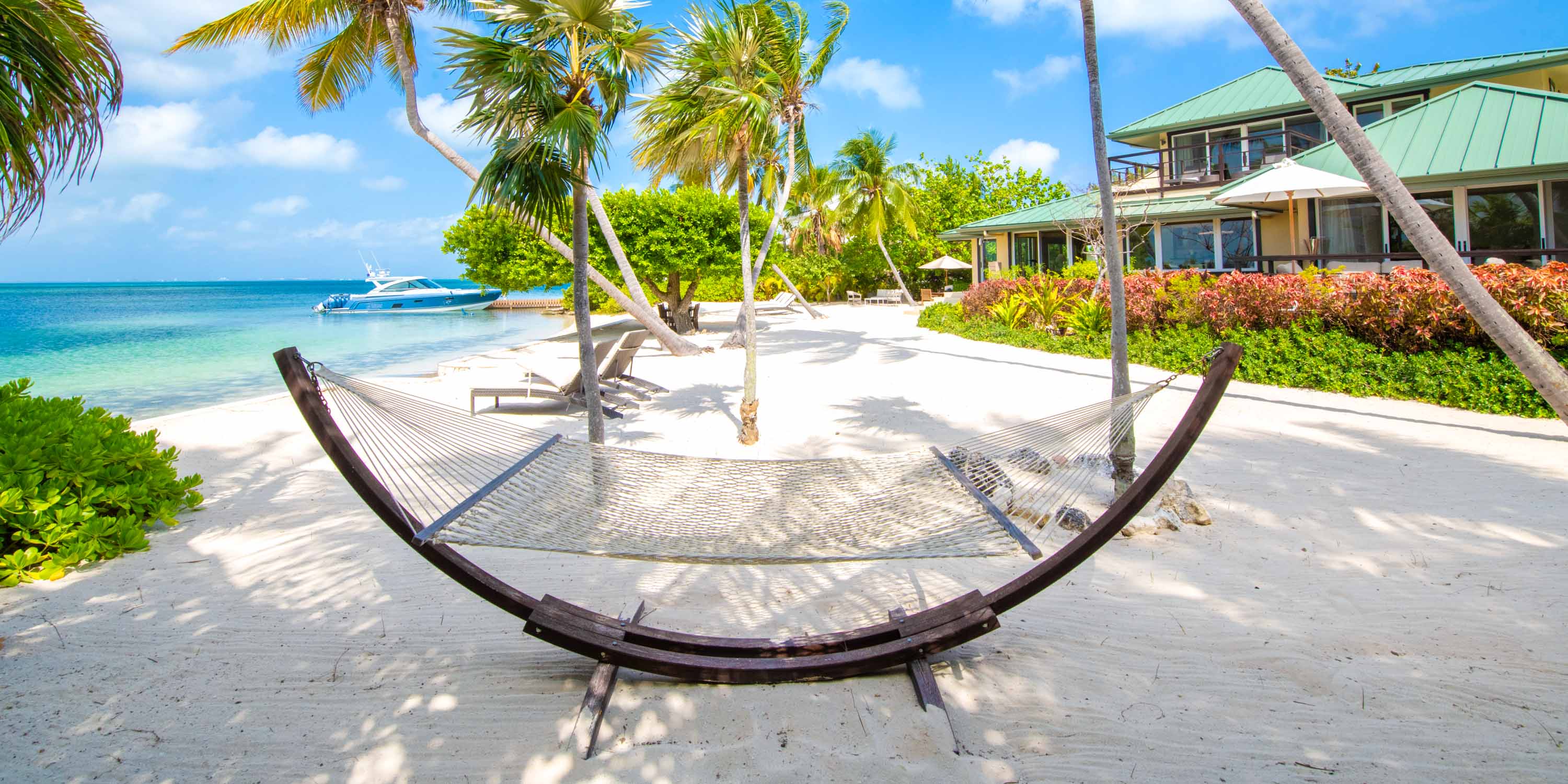 The white sand beach not only offers barefoot swimming but also has lounge chairs, a palm-shaded hammock, and a propane grill for cooking by the sea.