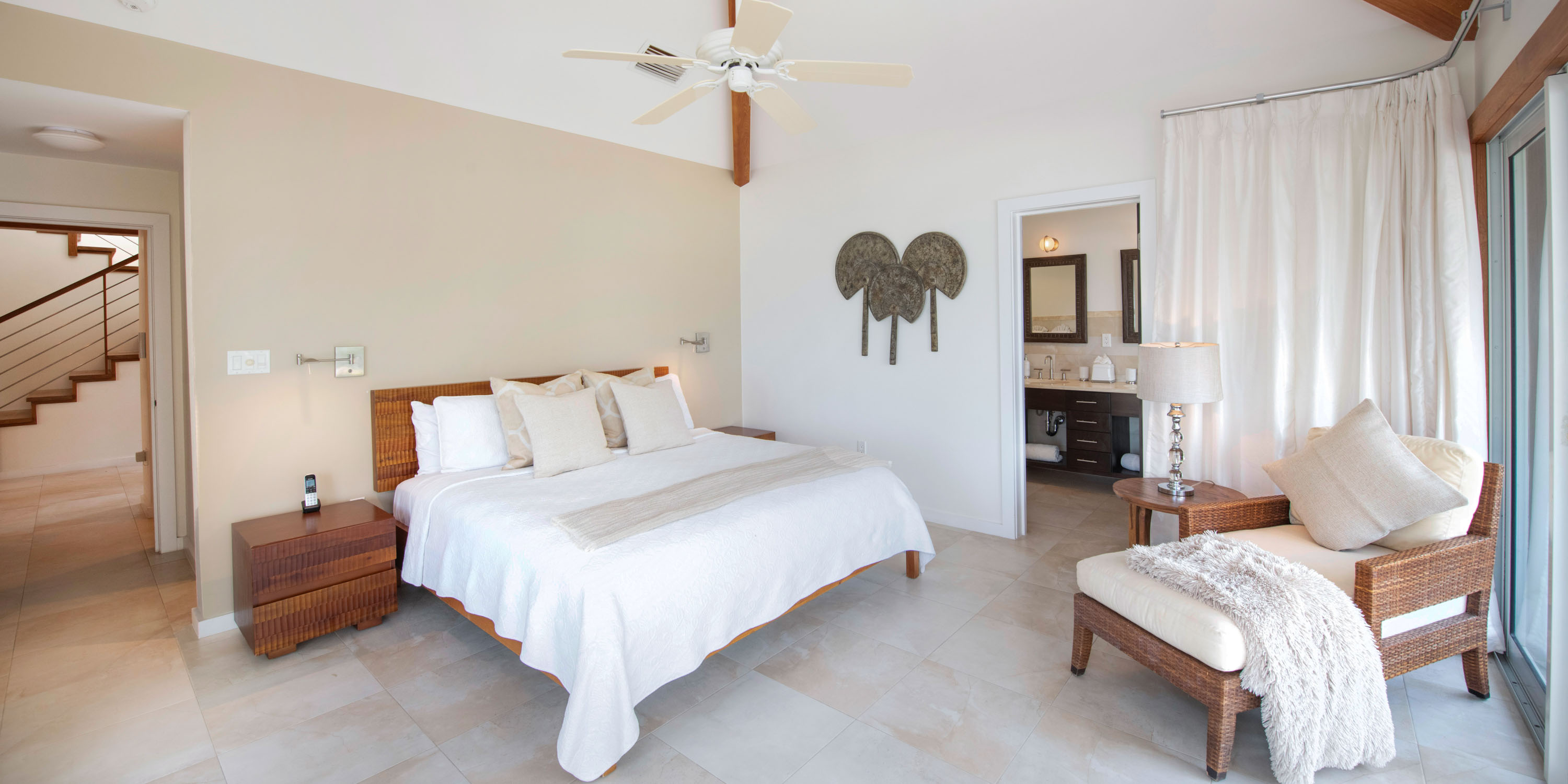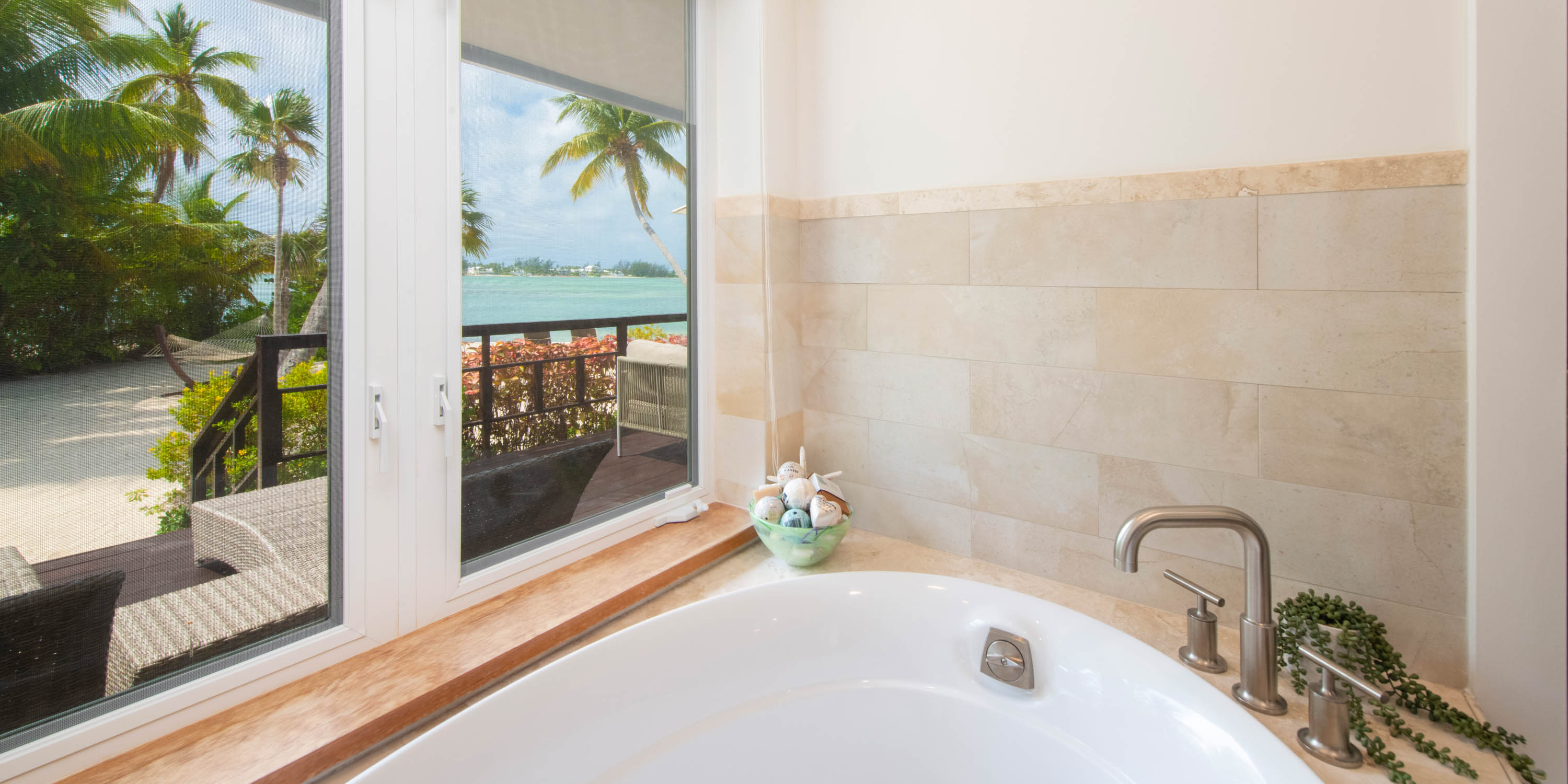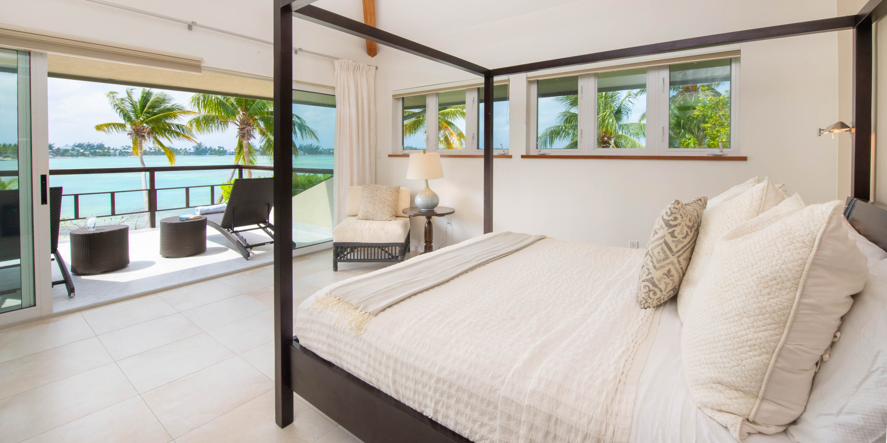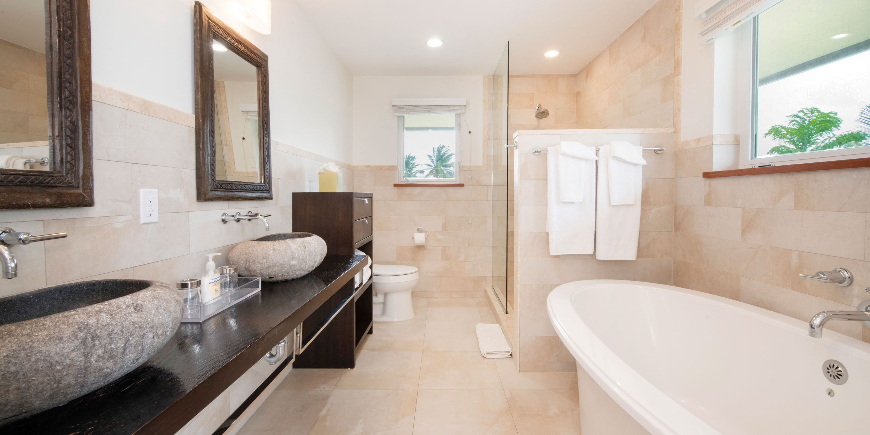 - Bedroom 1: primary suite, upper-level, oceanfront, king bed, walkout access to a private furnished balcony, walk-in closet, ensuite with dual vanity, soaking bathtub, and separate shower.