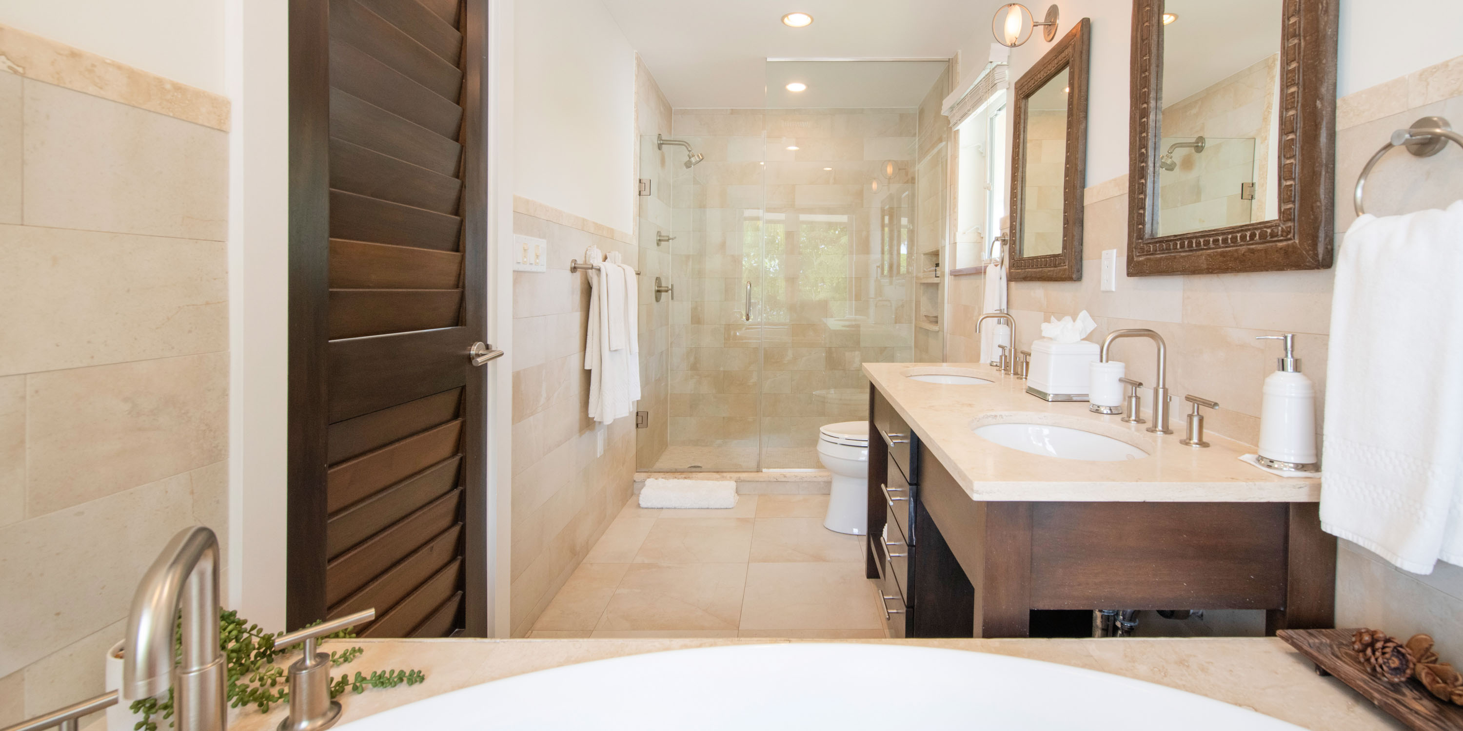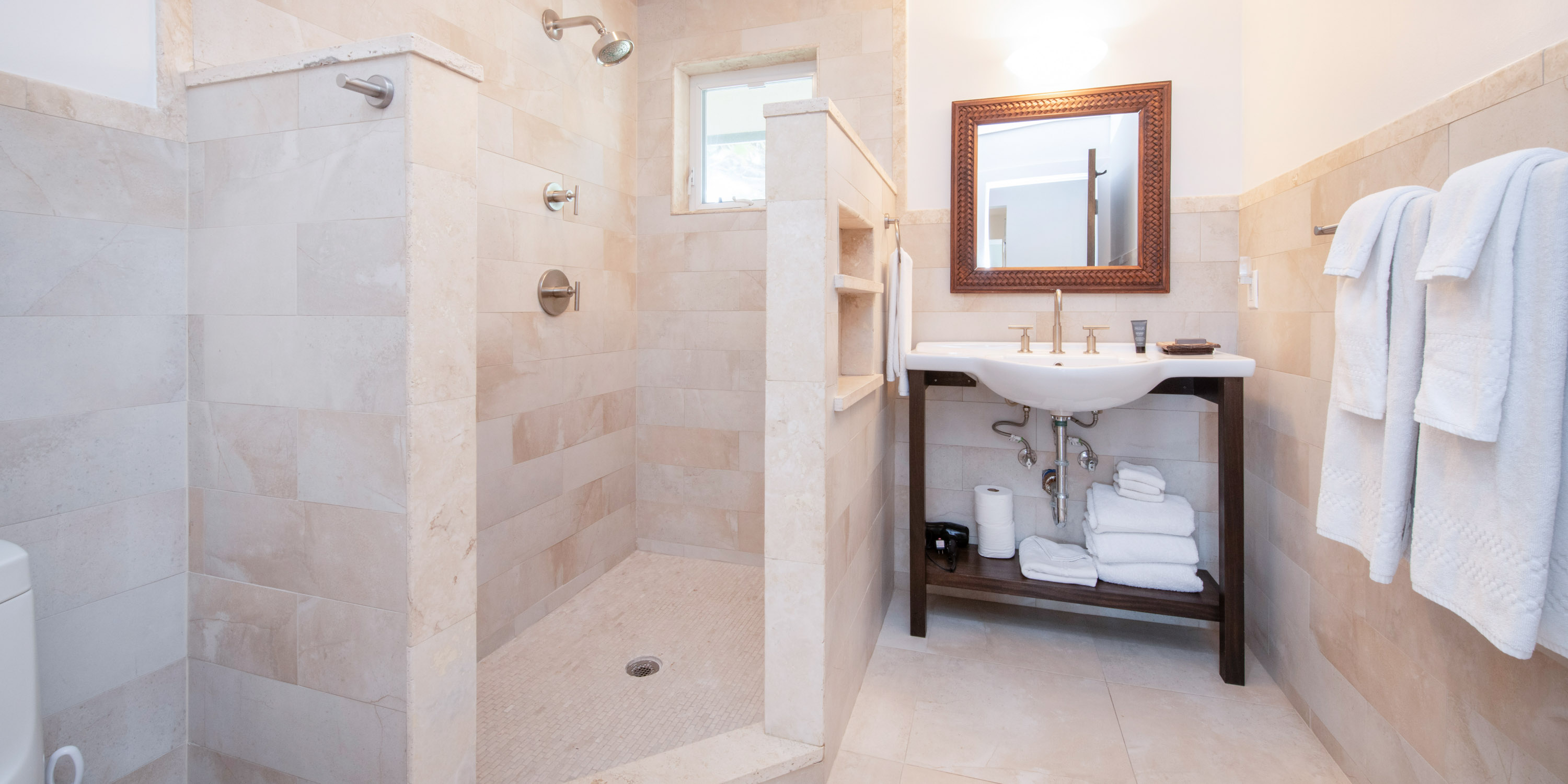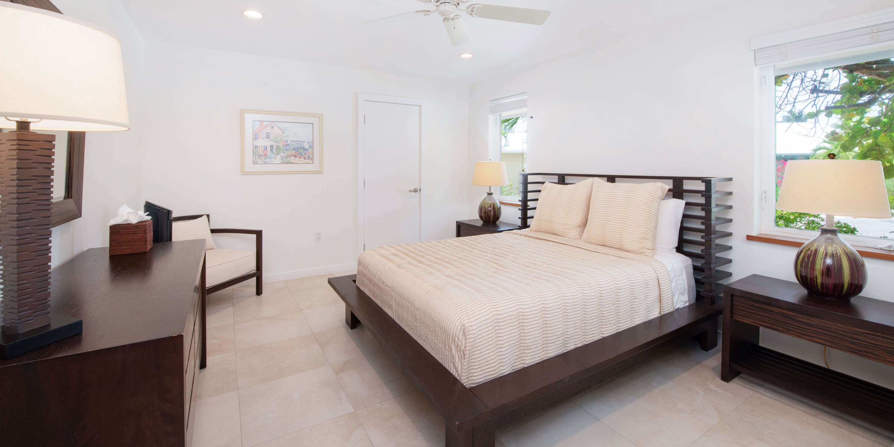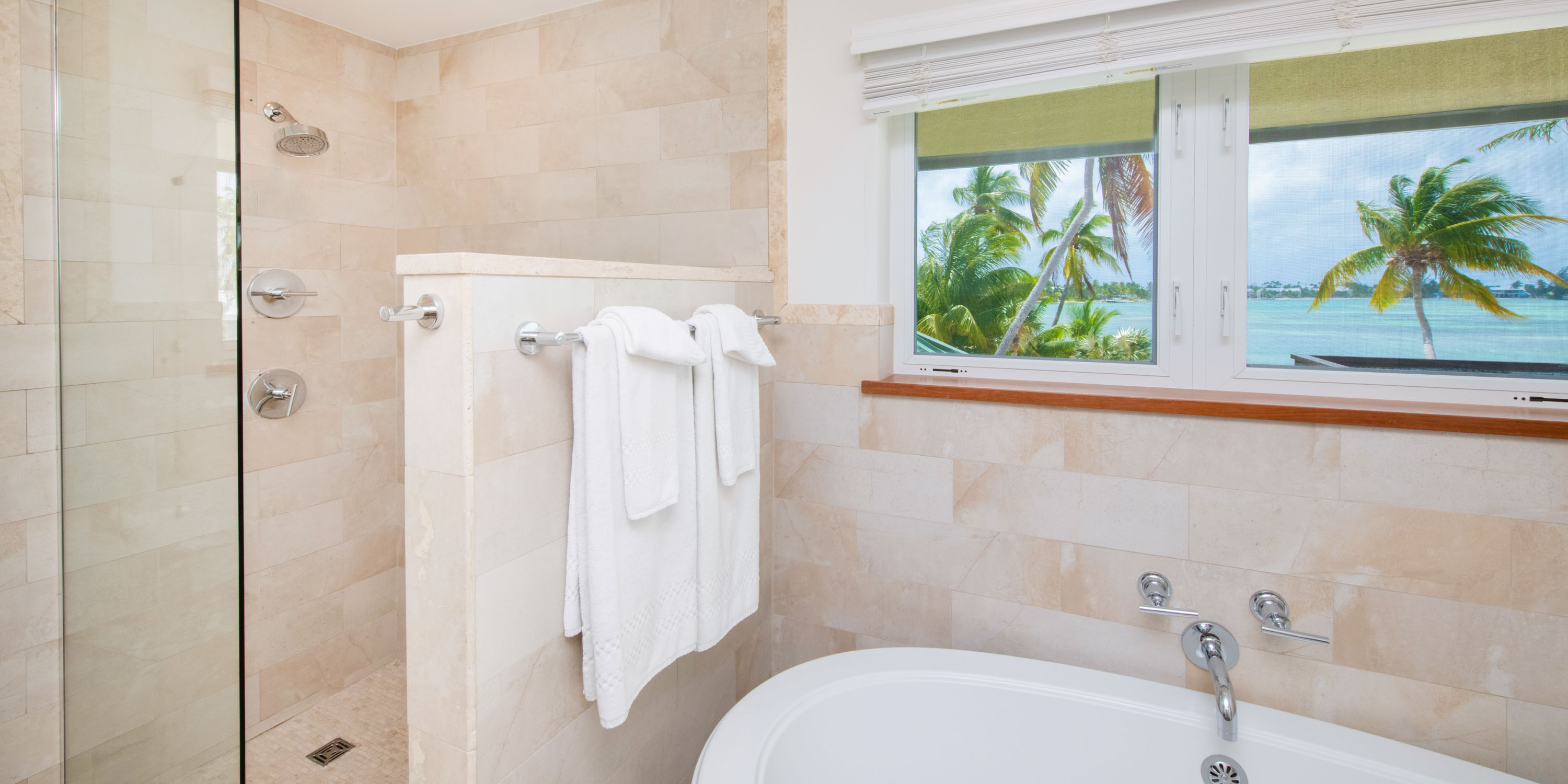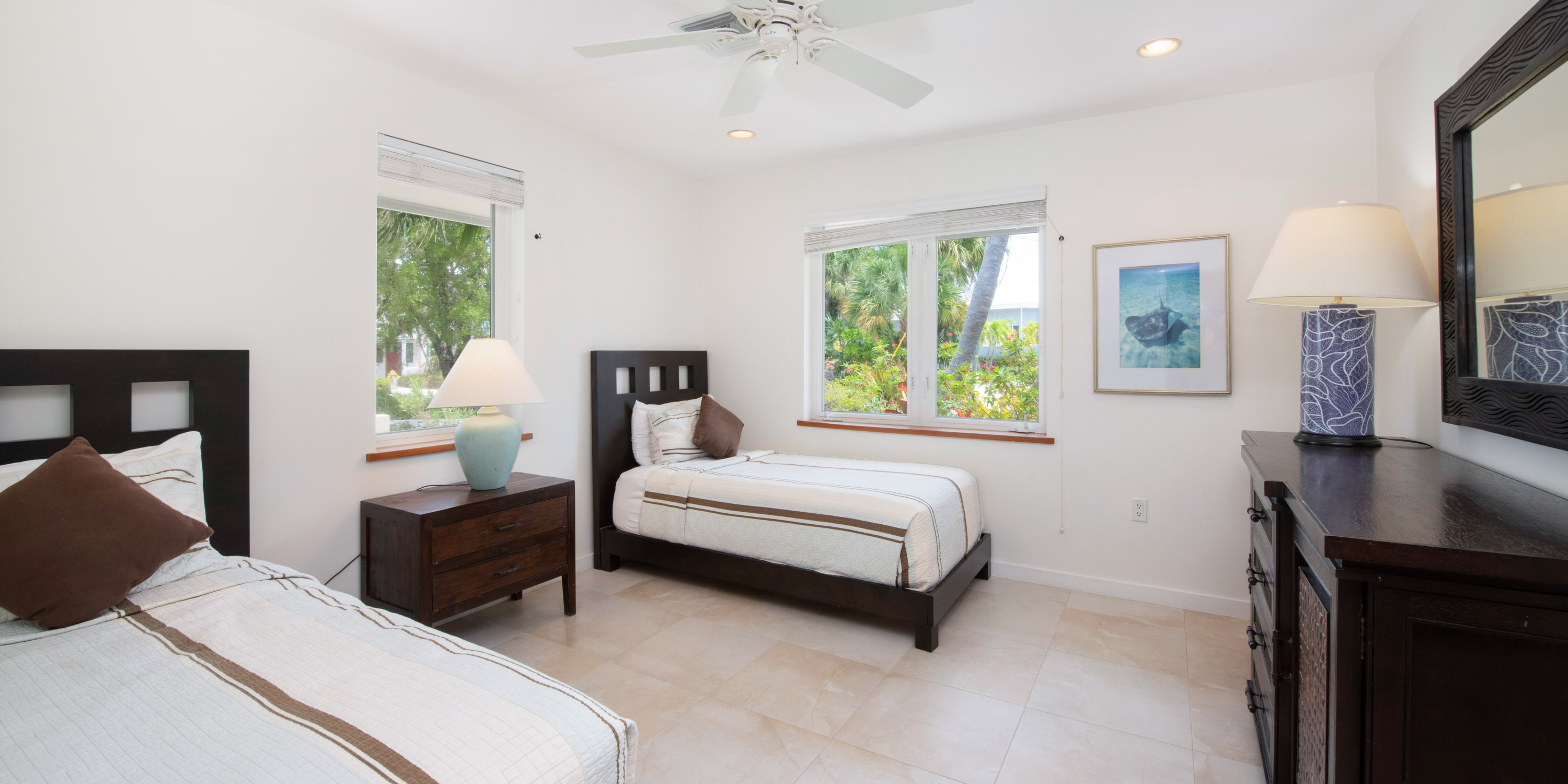 - Bedroom 4: lower level, island views, two twin beds, shares adjacent hall bathroom equipped with a shower; twin beds can be fitted into a king bed upon request.