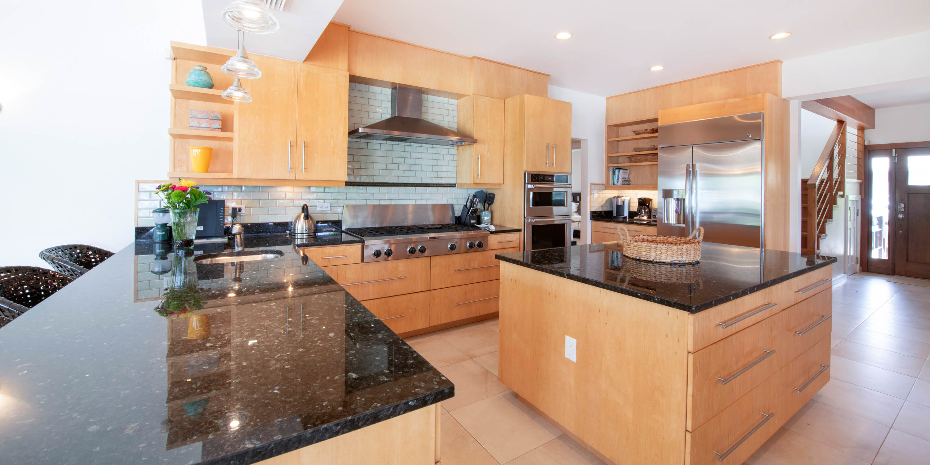 - Fully equipped, gourmet kitchen with granite countertops, island stove, double-oven, large stainless steel sink, dishwasher, and wine cooler