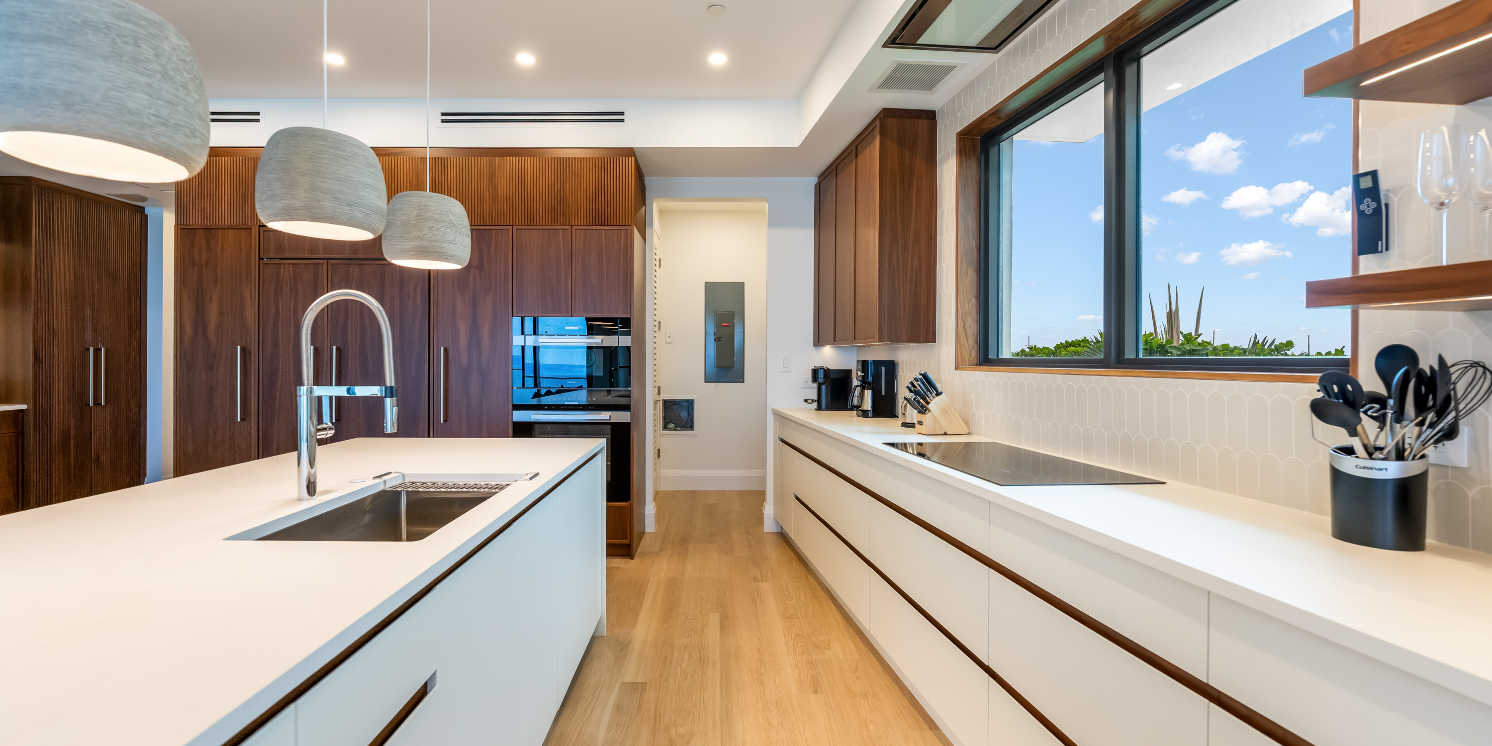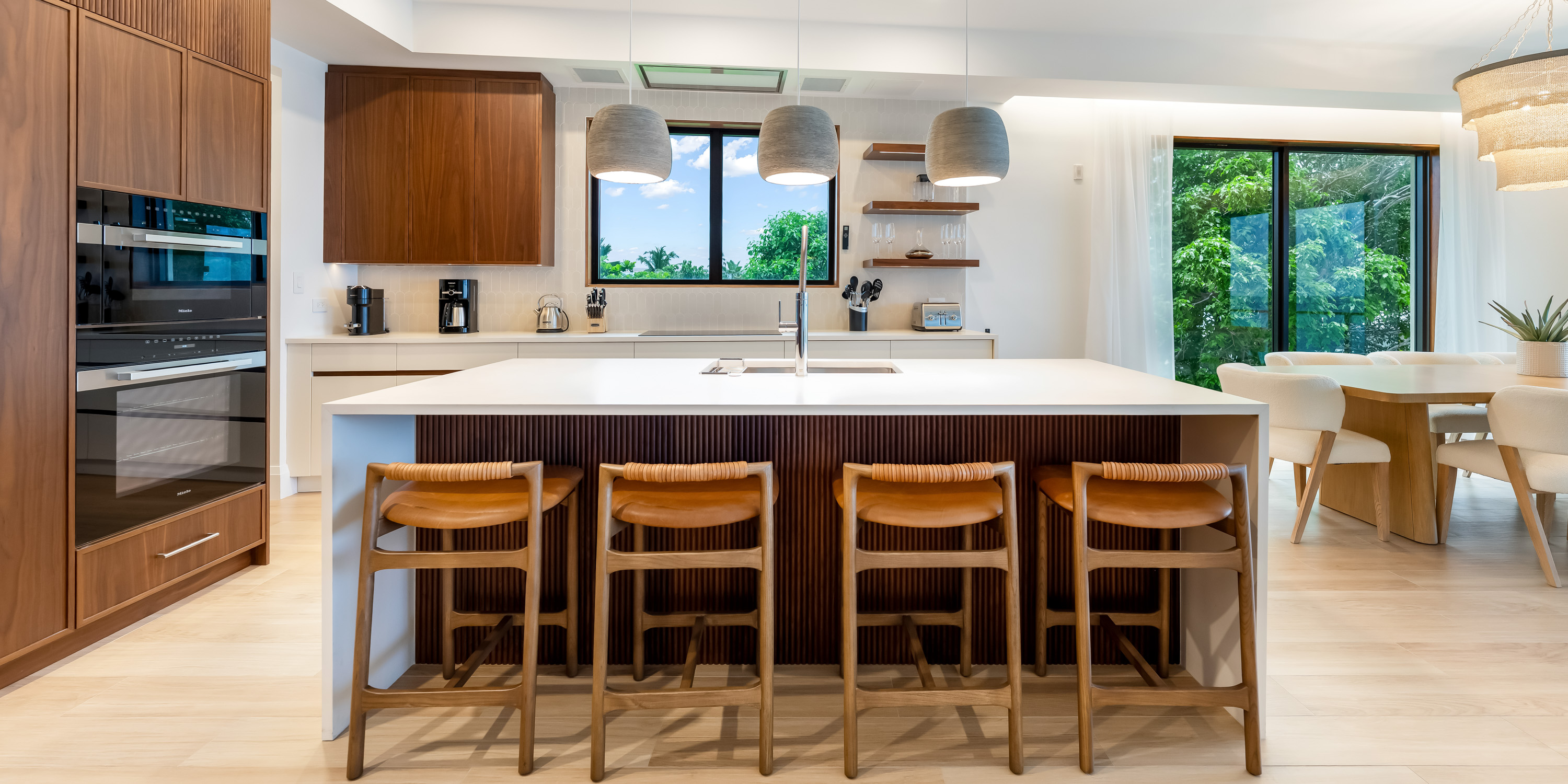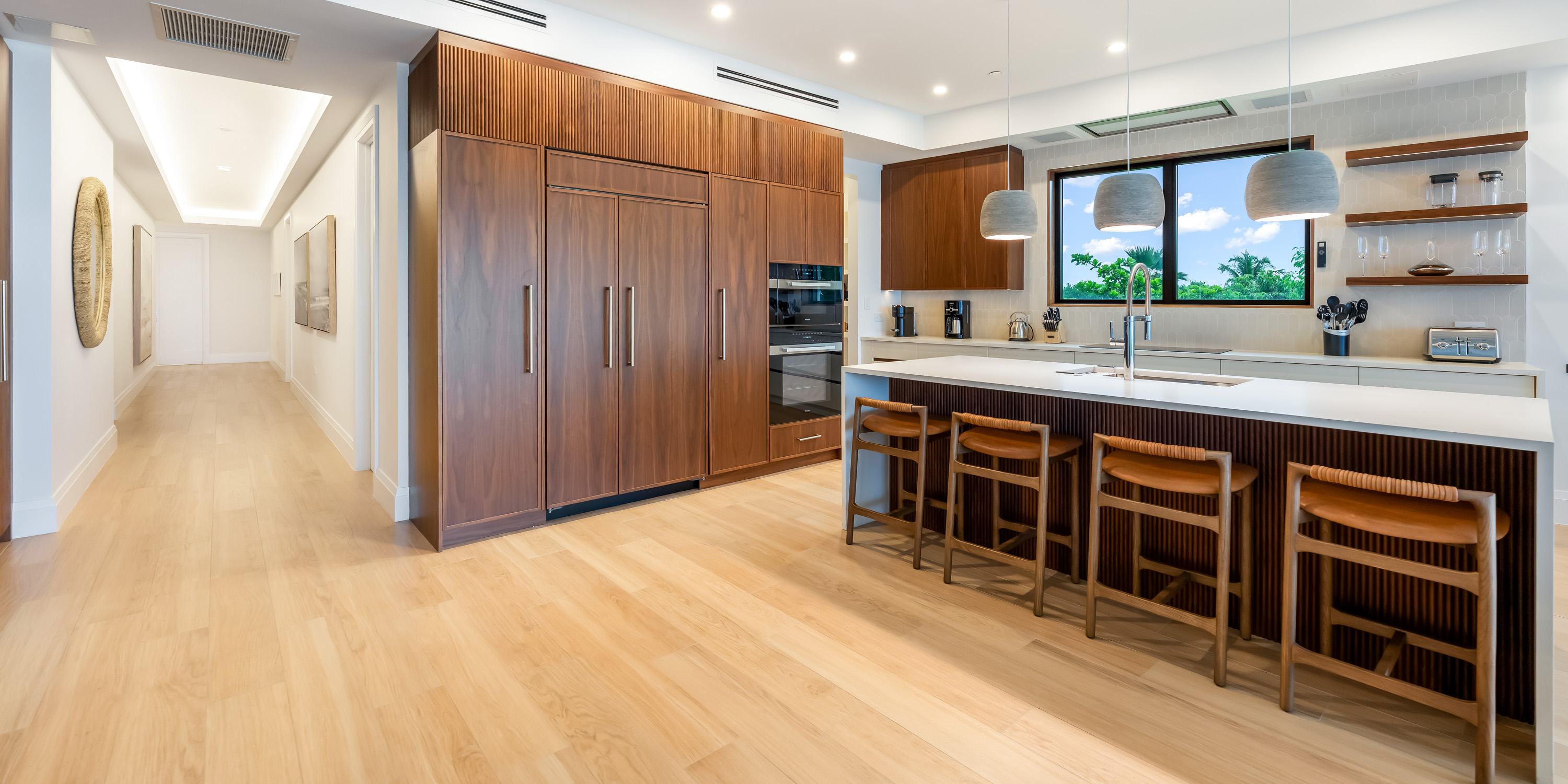 The chef’s kitchen, with top-of-the-line appliances and quartz countertops, is a culinary dream. A separate wine bar comes equipped with a sink and a beverage fridge.