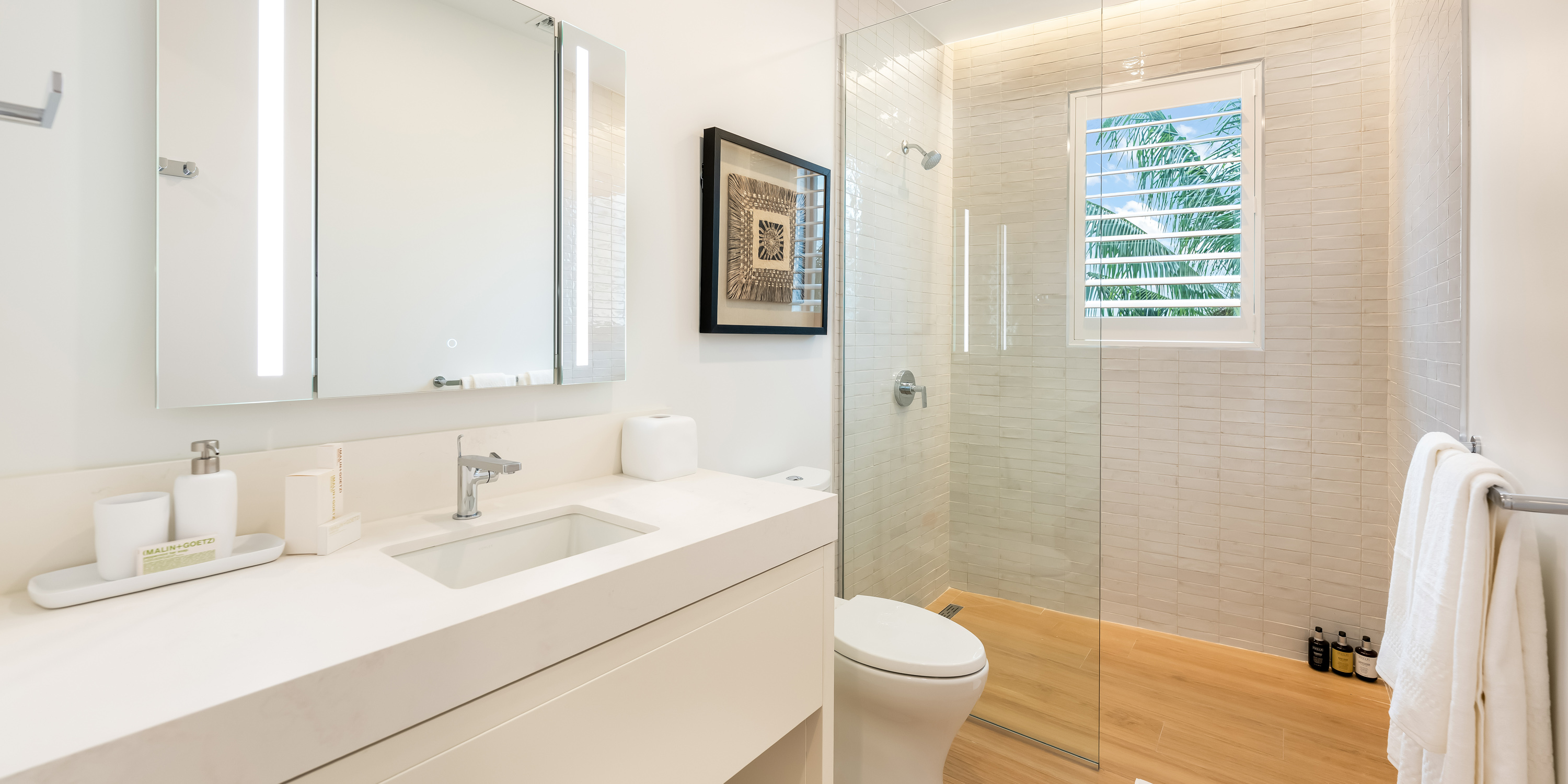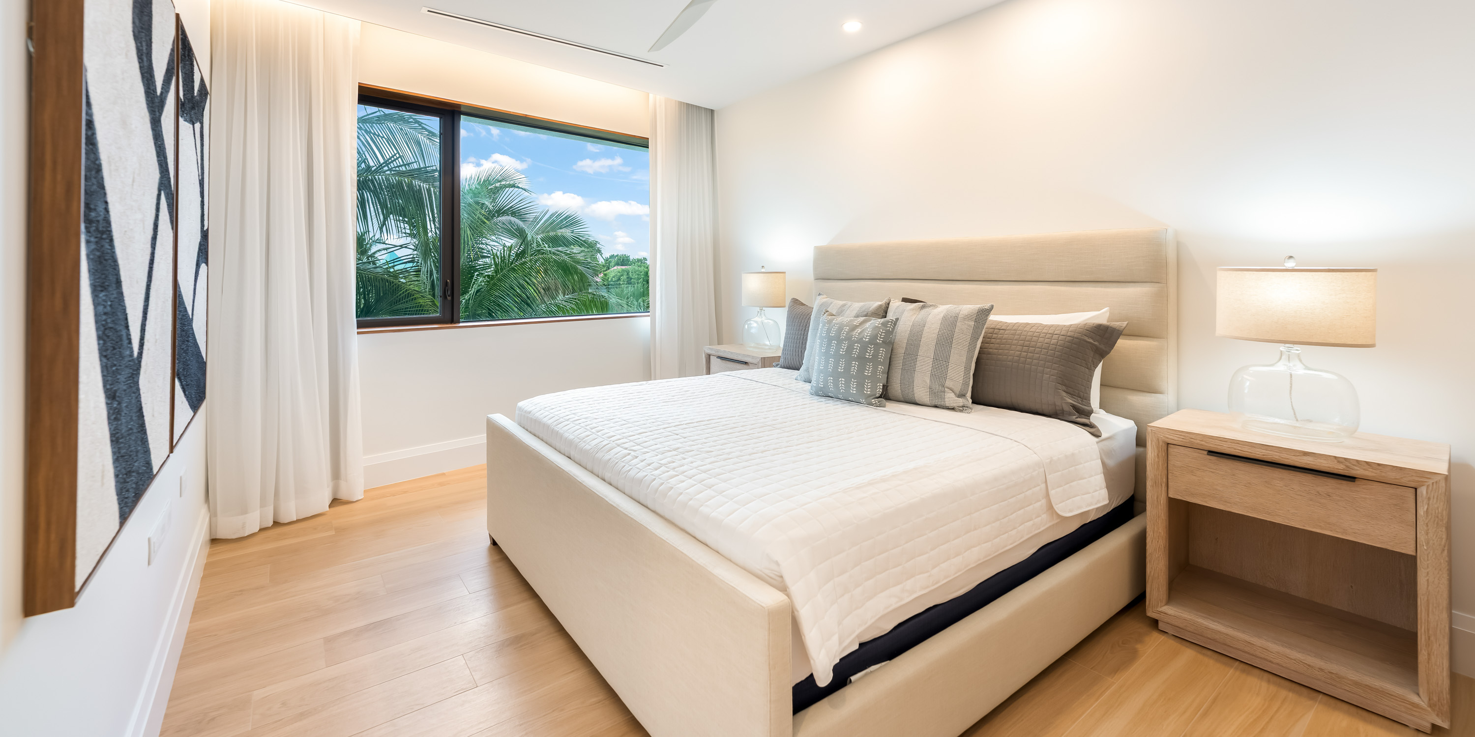 - Bedroom 1: primary suite, king bed, garden views, walk-in closet, guest safe, ensuite with dual vanity, soaking bathtub, and shower.