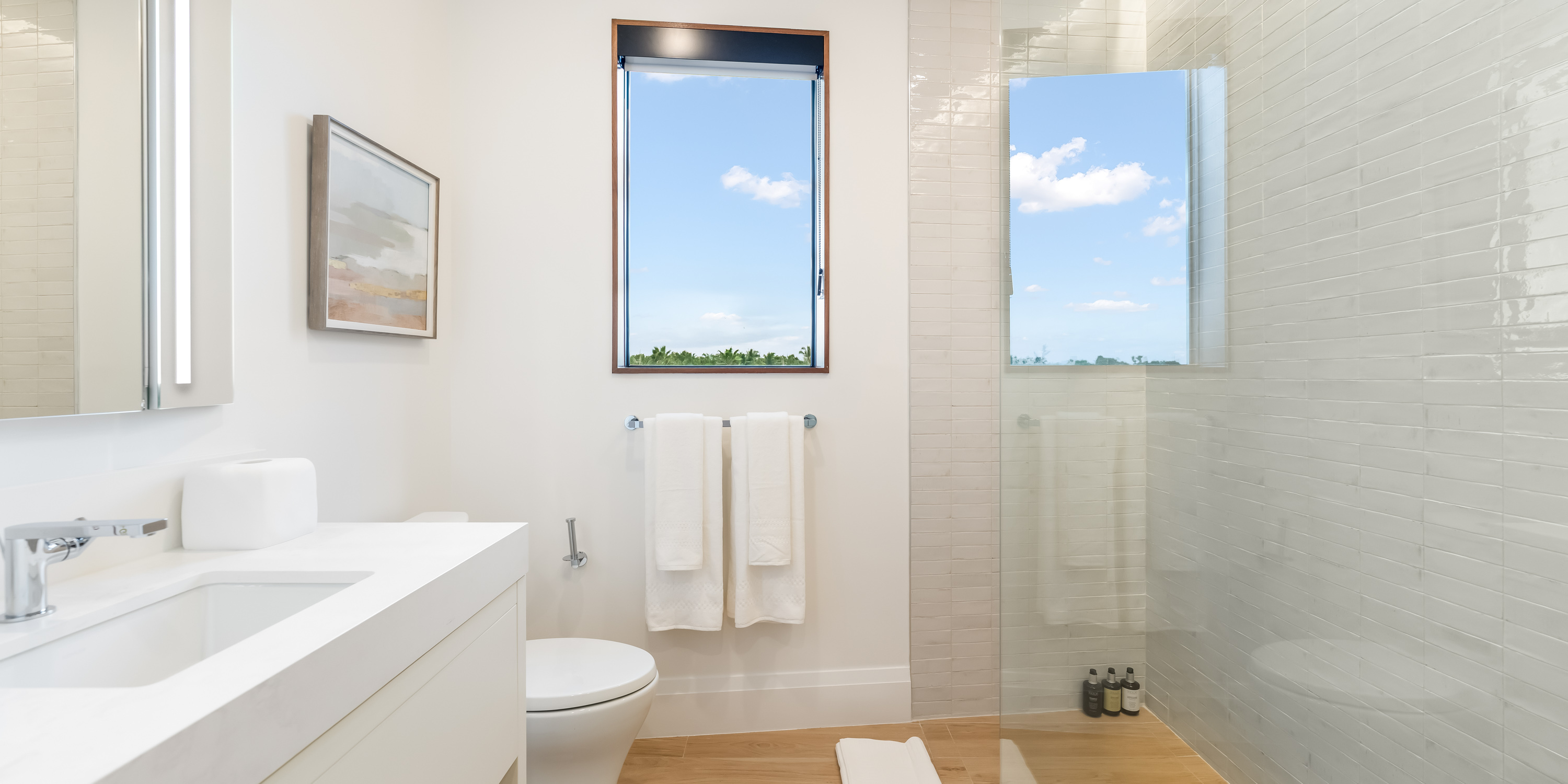 - Bedroom 3: queen bed, garden views, closet, ensuite with shower bath.
