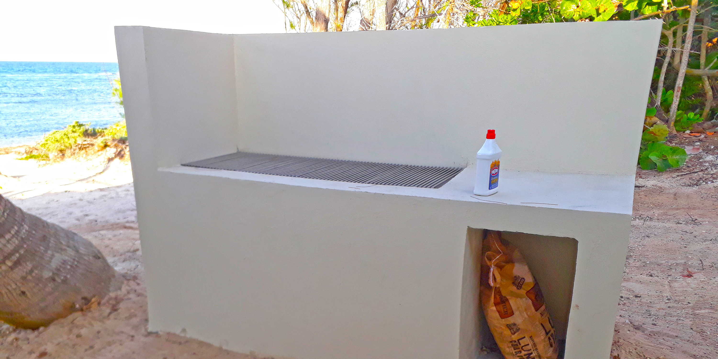 - Large, custom charcoal grill with breeze protection.