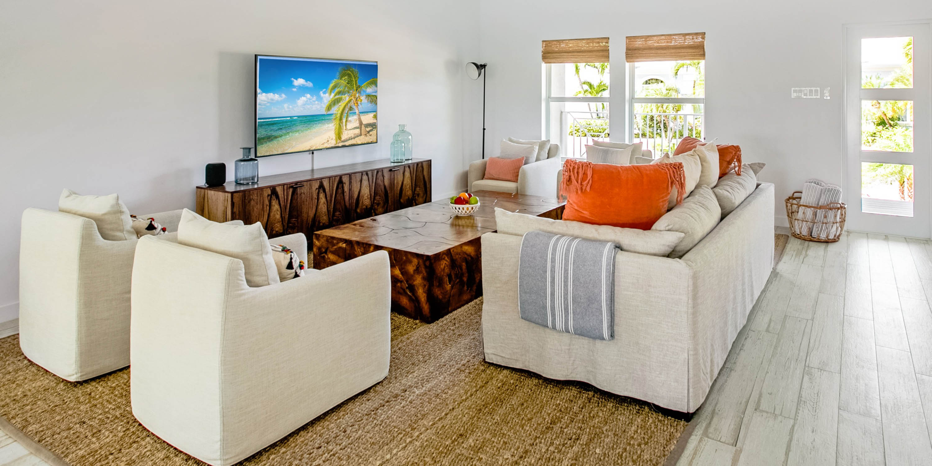 Inside the villa, a luminous vaulted great room welcomes you with plush sofa seating and a large high-definition television.