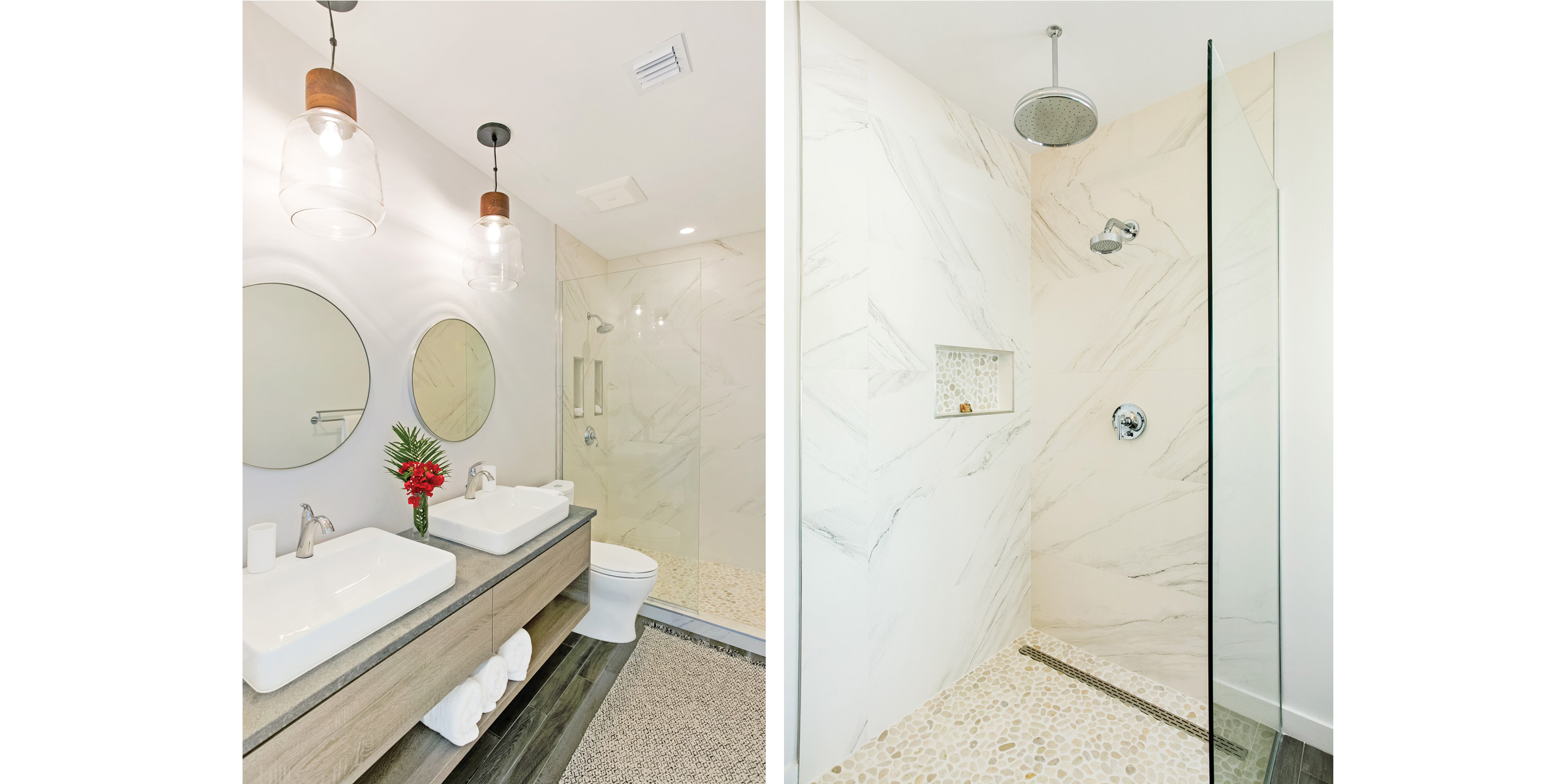 - Bedroom #2: lower level, queen bed, island views, shares hall bathroom equipped with dual vanity and walk-in shower.