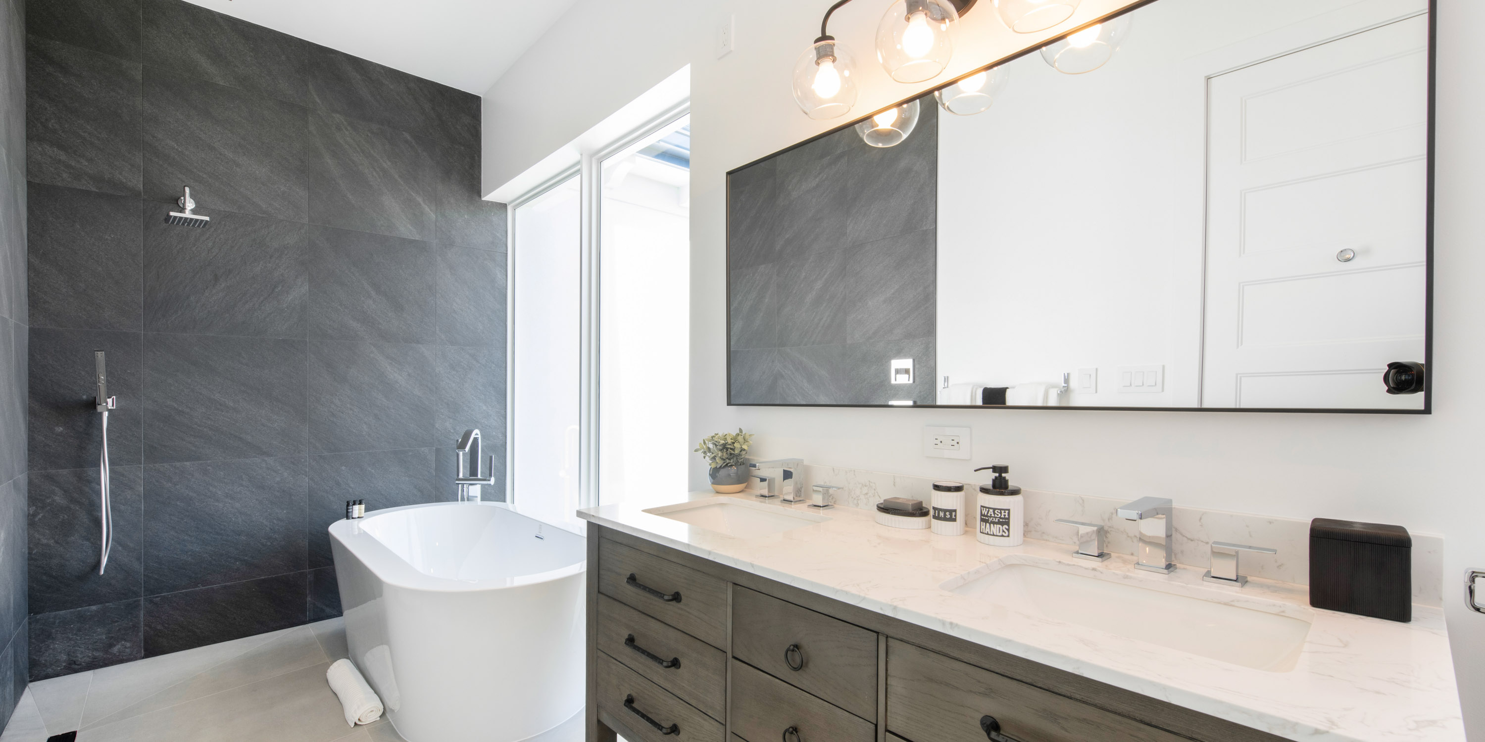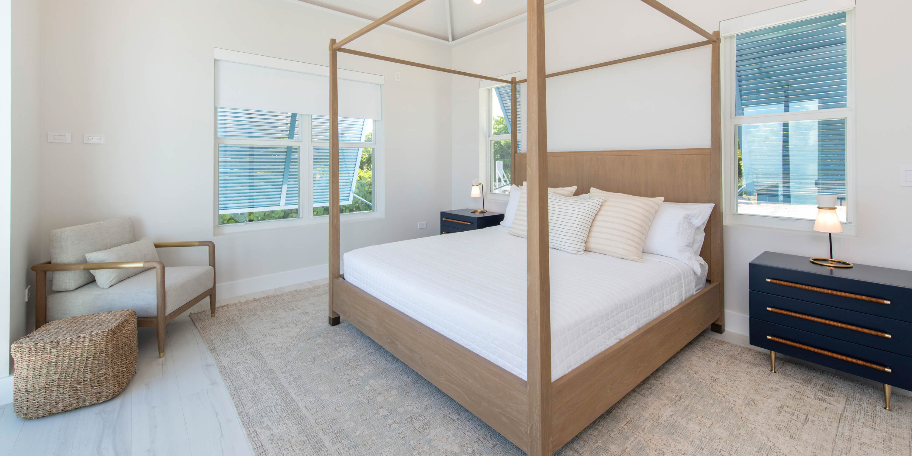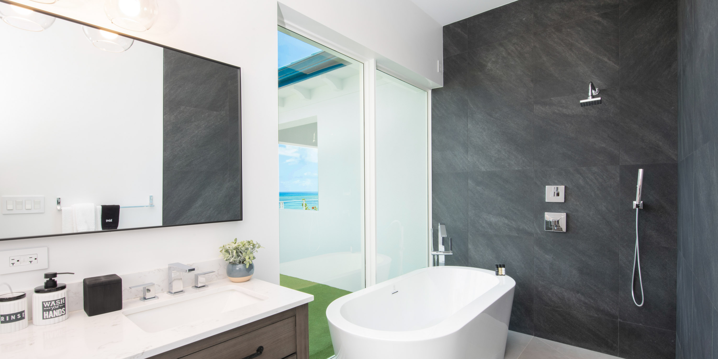 - East Suite: oceanfront views, king bed, walkout access to the beach, vaulted ceilings, dual nightstands, ensuite with dual vanity, soaking tub, plus an open shower with water wand.