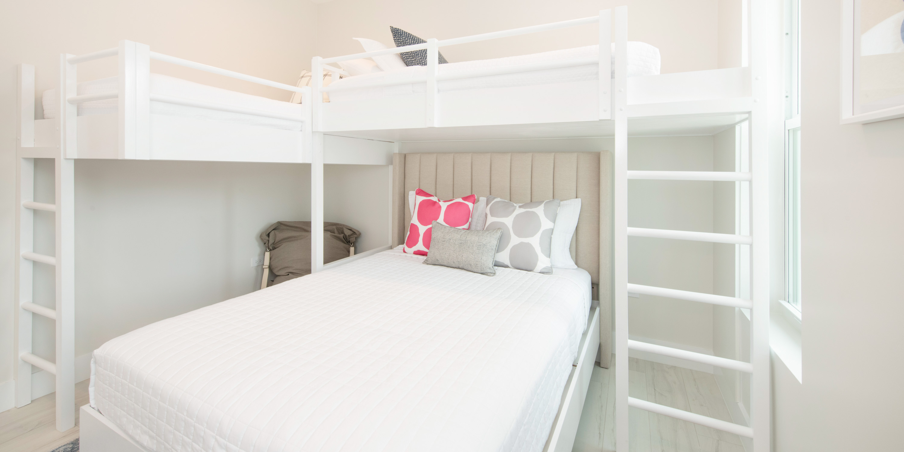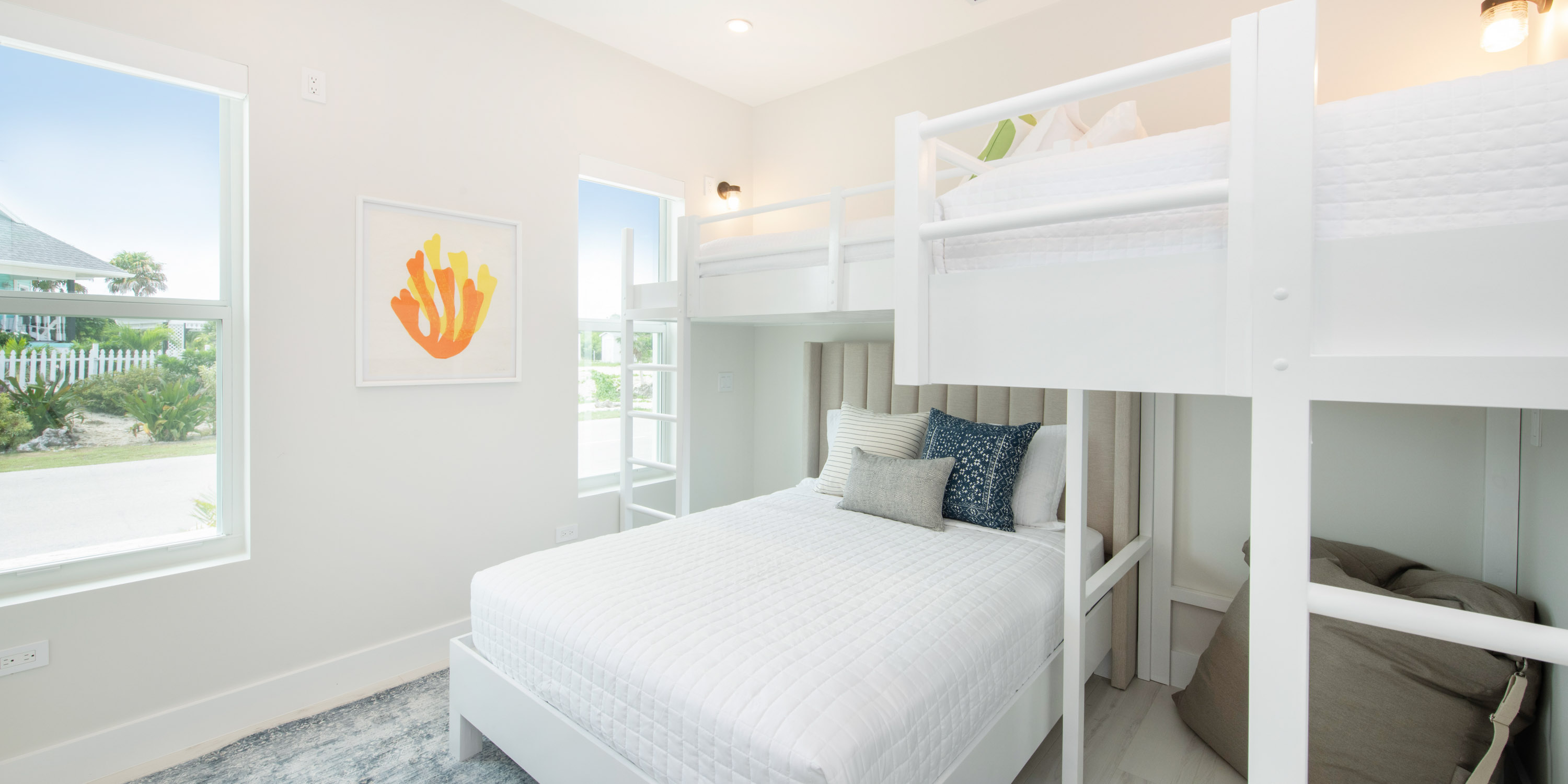 - Bunk Suite #1: queen bed + 2 upper twin bunk beds, island views, ensuite with shower.