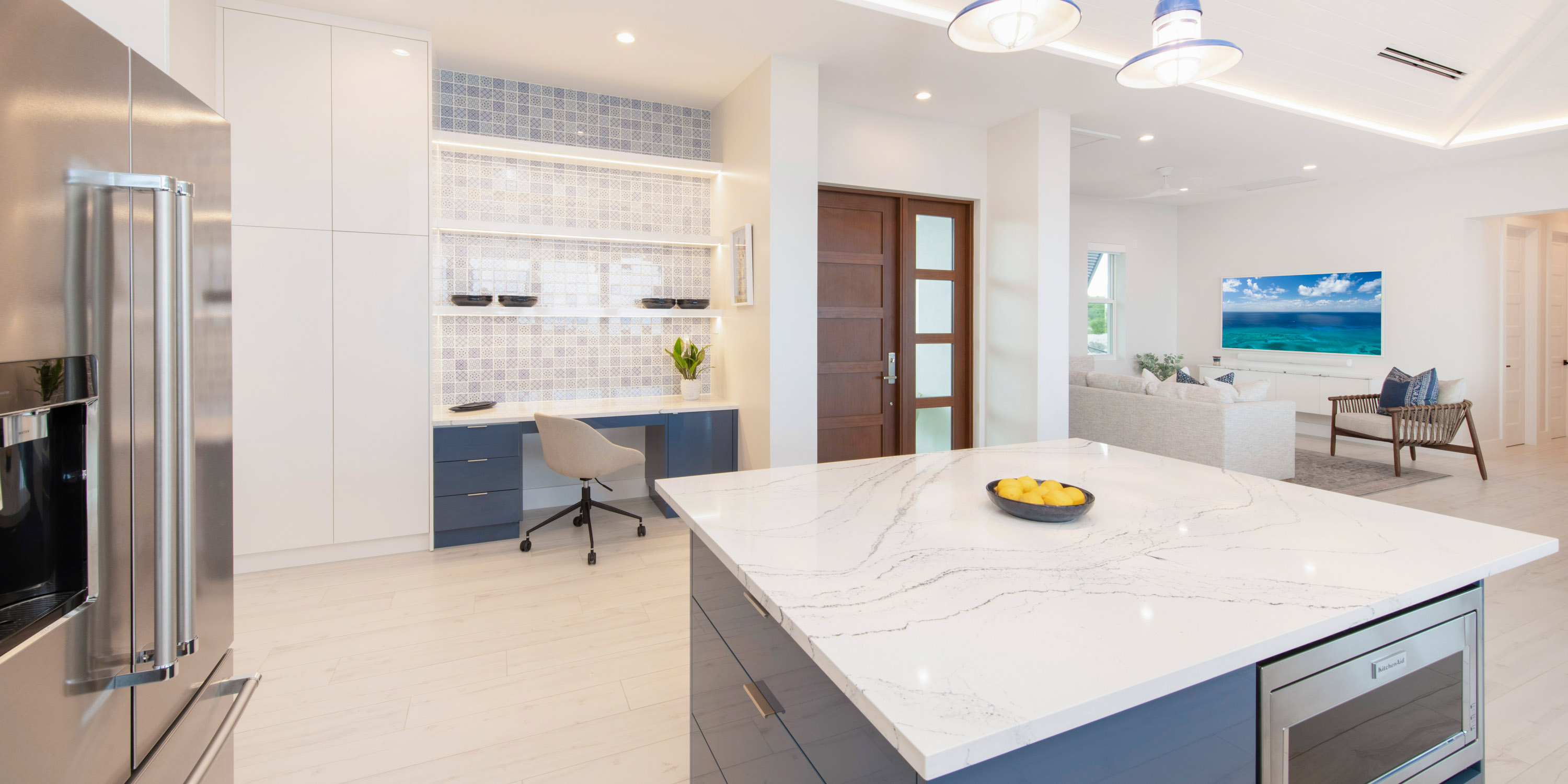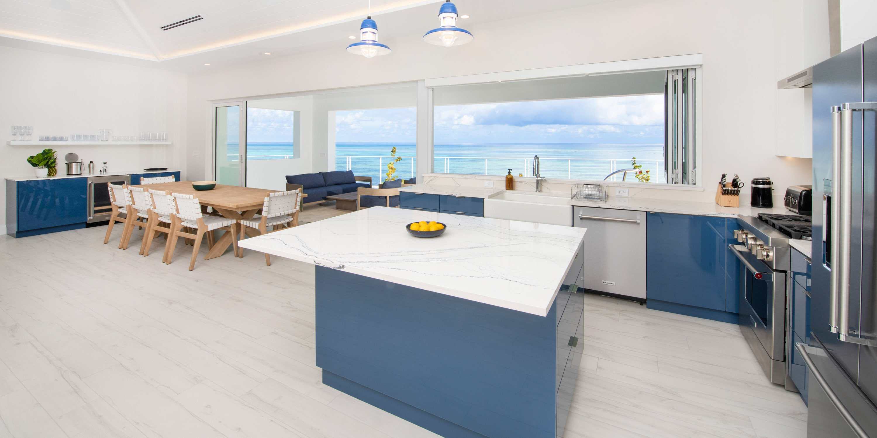 The living area is furnished with a plush sectional sofa and high-definition Samsung Frame television with Cable programming & Sonos soundbar. Folding glass doors provide seamless indoor/outdoor living allowing you to fill the great room with unobstructed oceanfront views. Each master suite has a vaulted ceiling, king bed and large bathroom with ocean views!